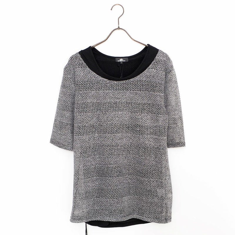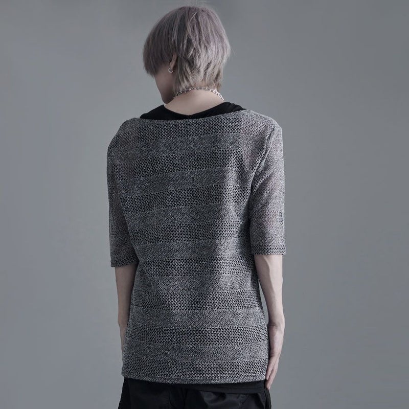 ネック周りを広めに設定した透かし編みの半袖ボーダーニットです。