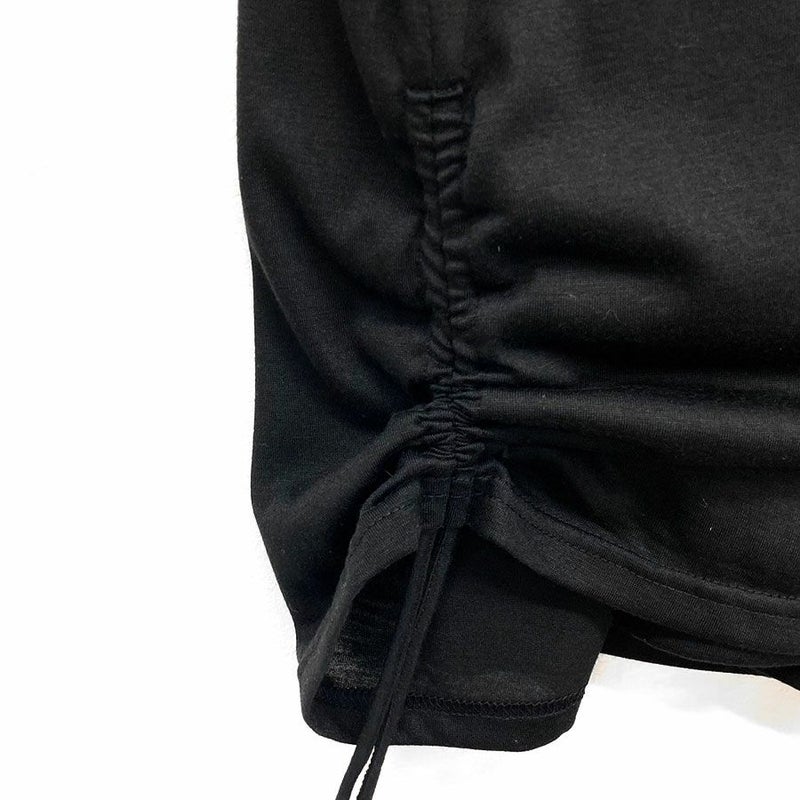 片側サイド裾にコード付きでギャザーを調整するデザインを配置したことによりギャザーをクシュクシュすることでアシンメトリーなシルエットも楽しめるタンクトップです。