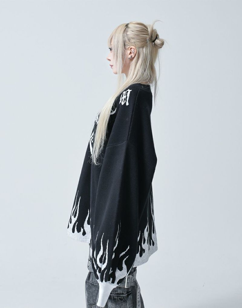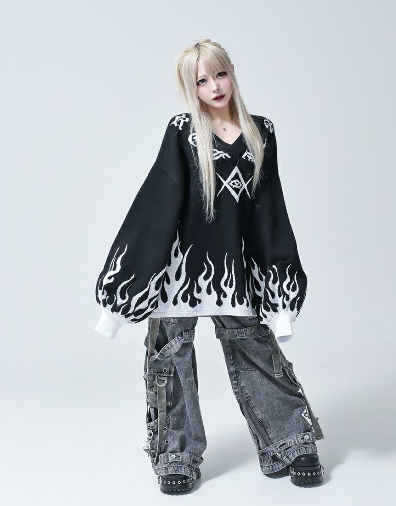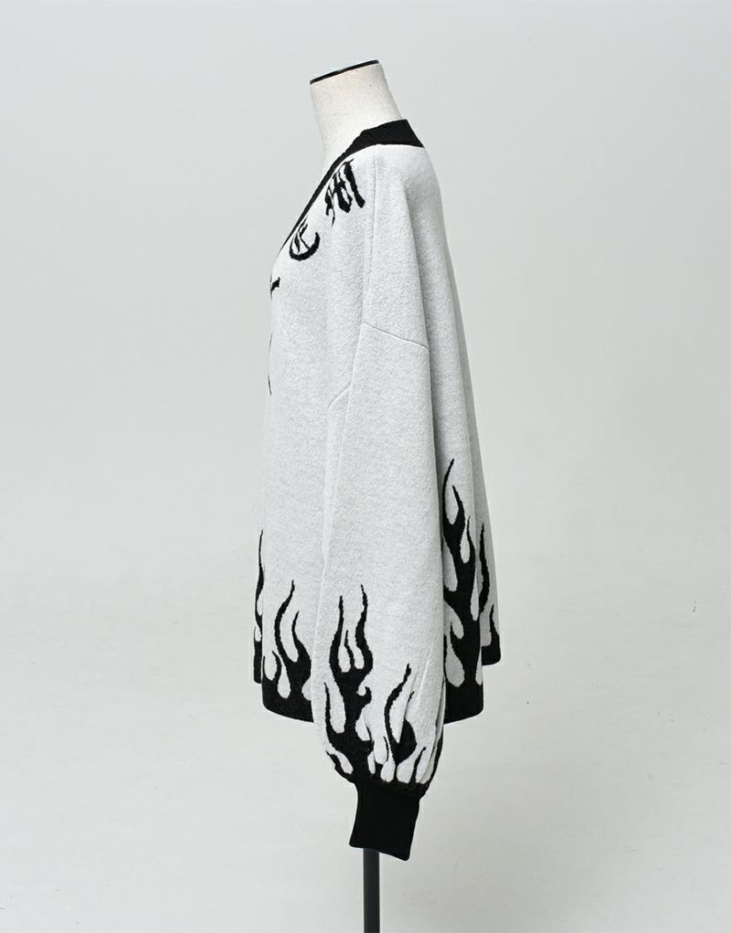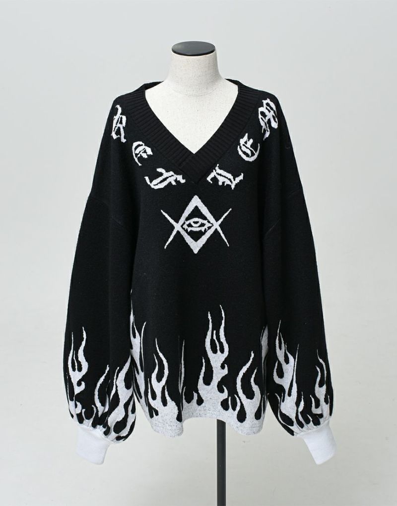 Vネックに沿うようにロゴとモチーフを入れ、裾・袖口上にファイヤーパターンを入れたプルオーバーニットです。