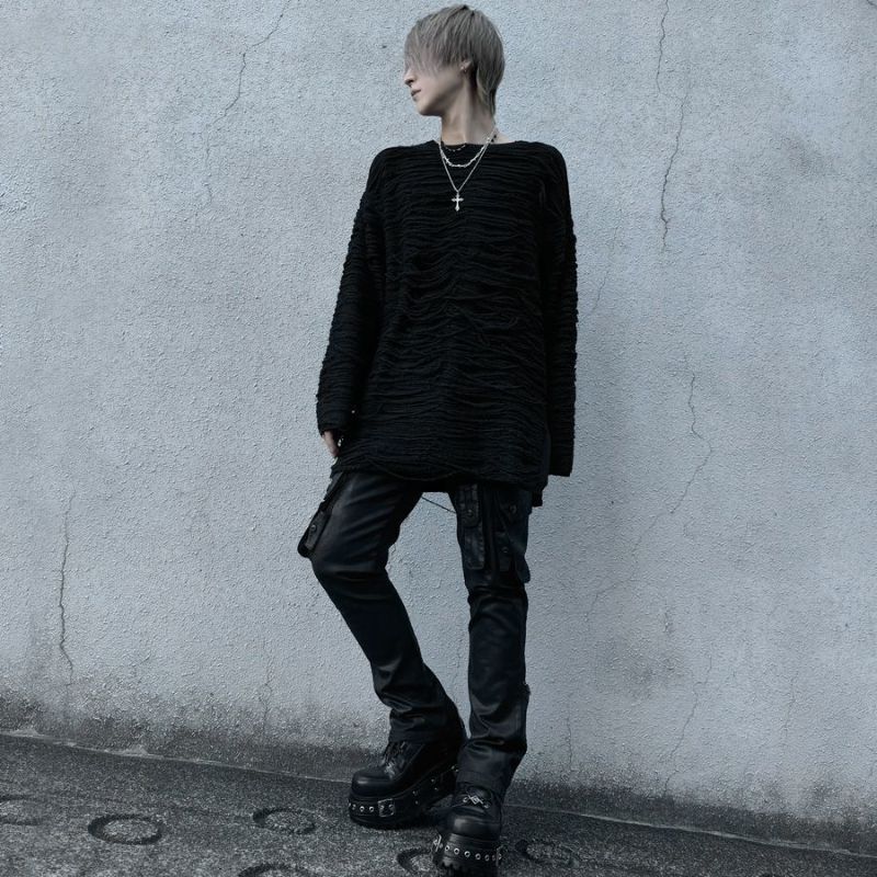 最初はスラブ糸がきれいに整列されていますが(※商品単体撮り参照)お好みでほどくようになじませてよりクラッシュ感やグランジの雰囲気を楽しむことが可能です。