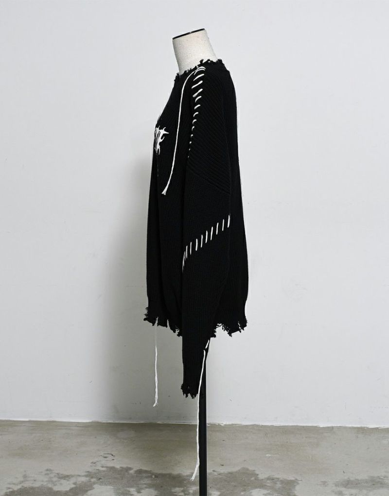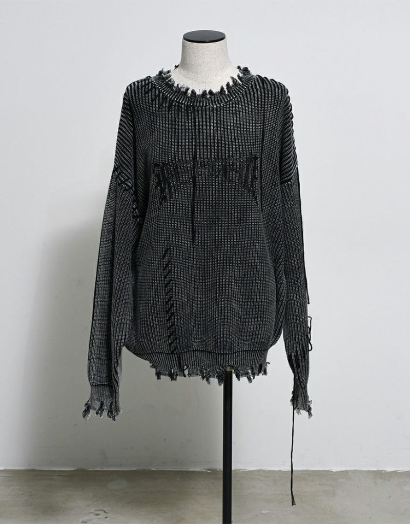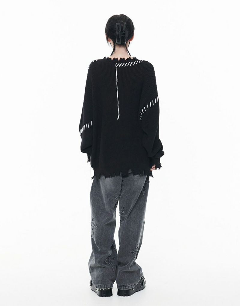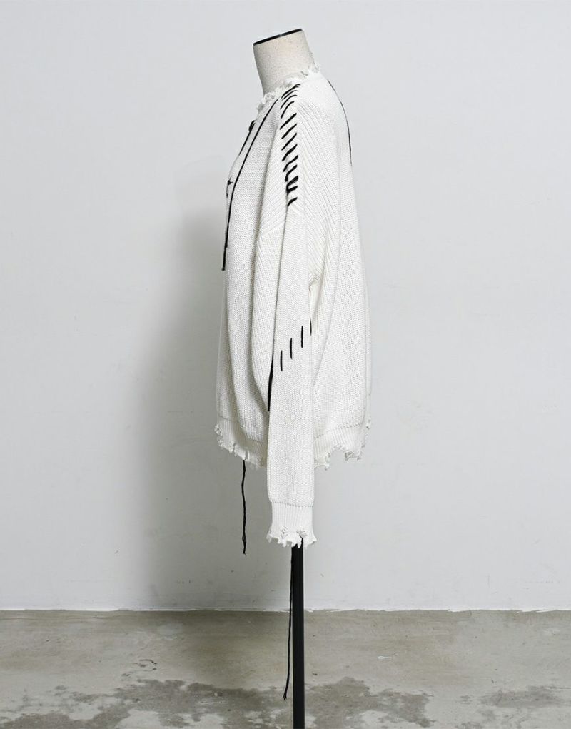 ネックや袖、裾にブロークン加工を施し、更にポイントで配色のステッチングを入れた拘りのニット。