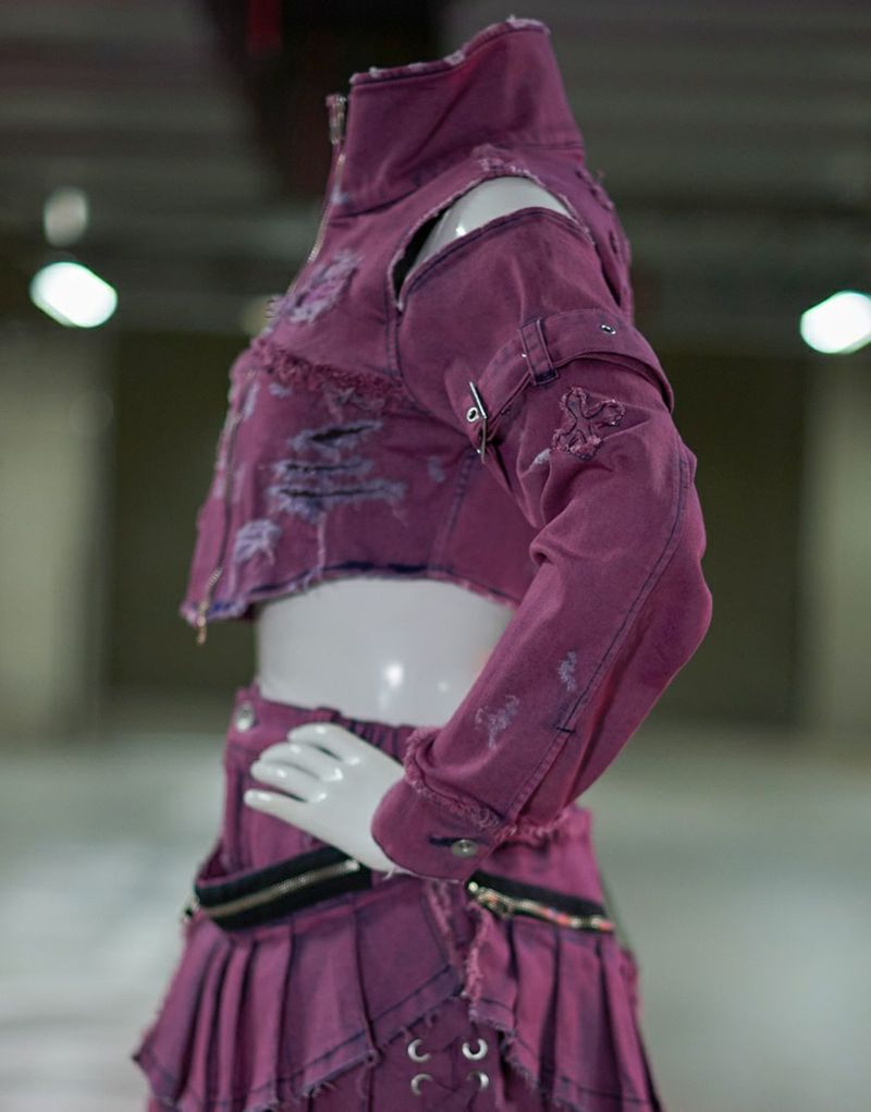 Gray色はブラックデニム生地を洗い加工、Purple色はIndigoデニム生地をパープル系に染め加工を施しました。