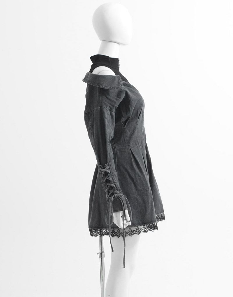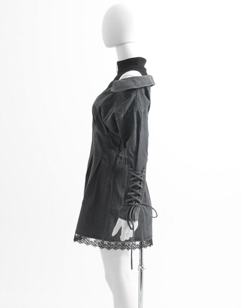 オフショルダー×ハイネックのアンバランスなレイヤード風デザインで、儚さと強さを同時にまとえる、まさに二面性のある一着。