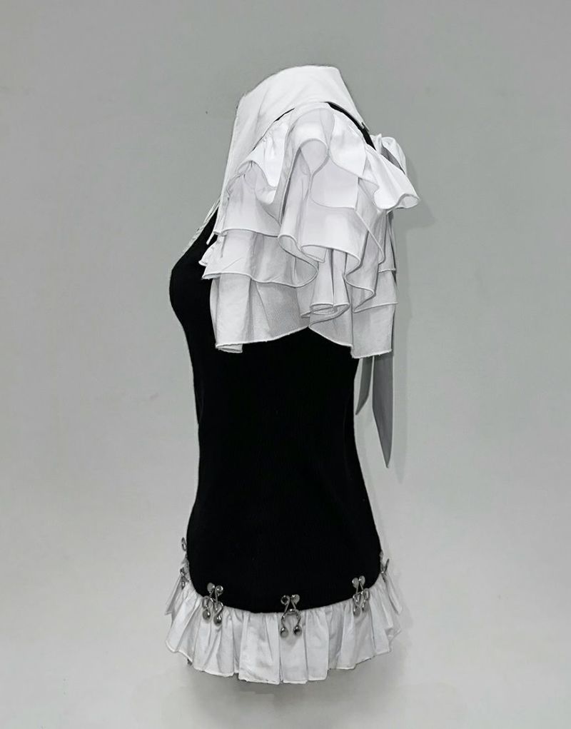 デビルのツノをモチーフにした襟と、天使の羽を思い浮かばせる袖、ニット生地で腰回りがフィットして細見え効果も