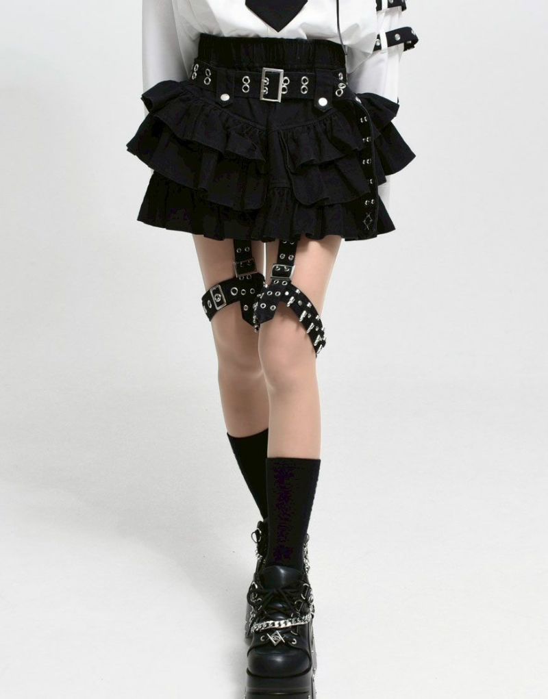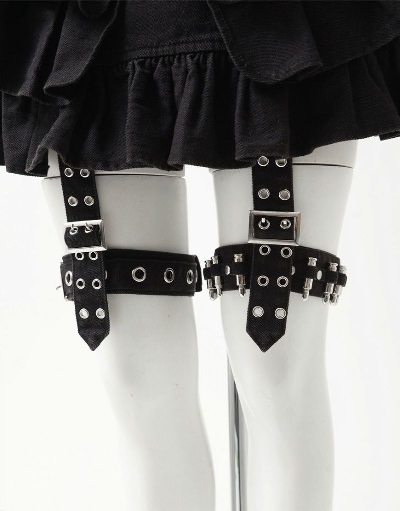 右足のガーターベルトにはハトメとバックル、左足には弾丸モチーフを差し込んだ遊び心ある仕様で、左右非対称のデザインがコーディネートに奥行きを与えます。