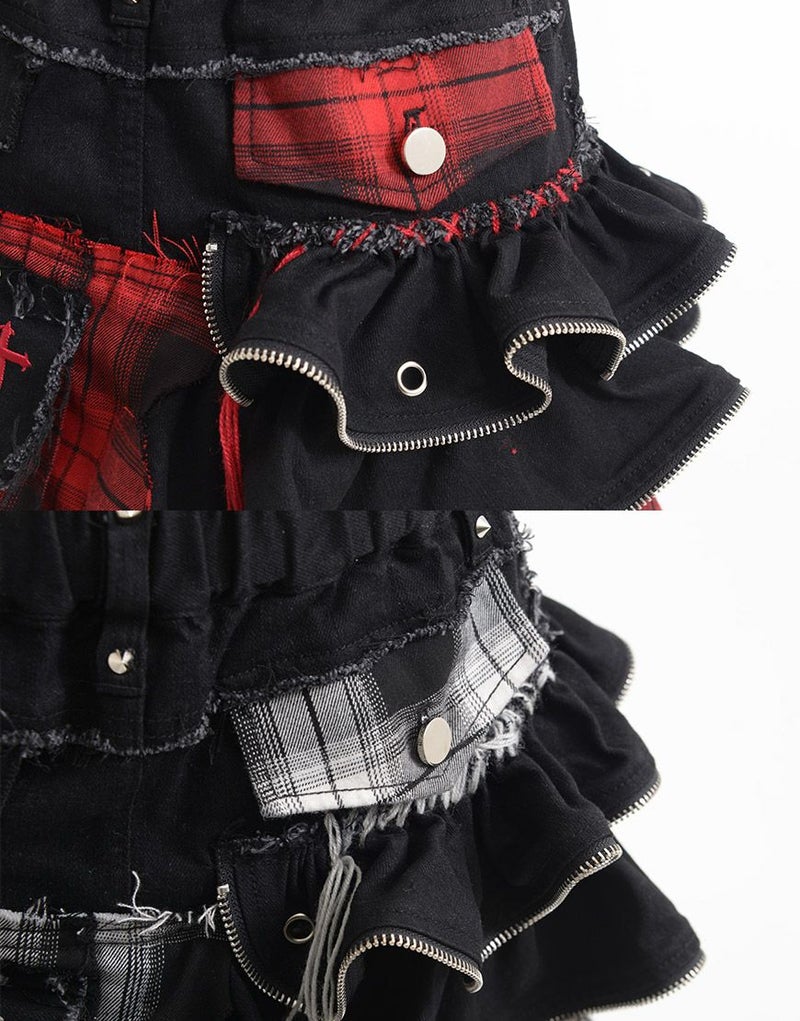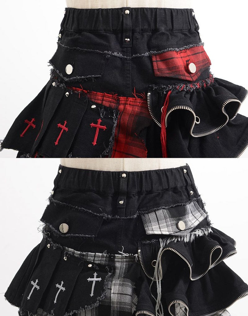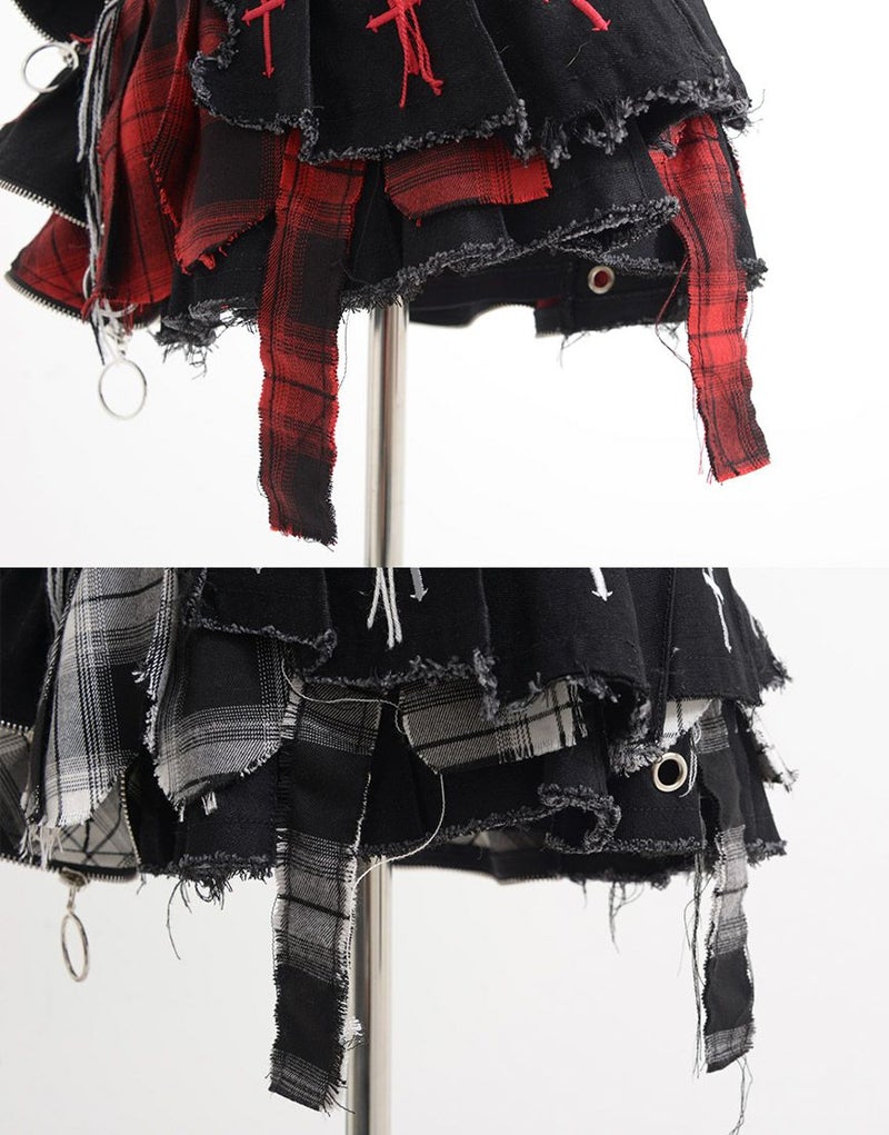 右サイドはZIP付きのフリルスカート風、左サイドはプリーツ調のパーツを重ねたアシンメトリー構成。