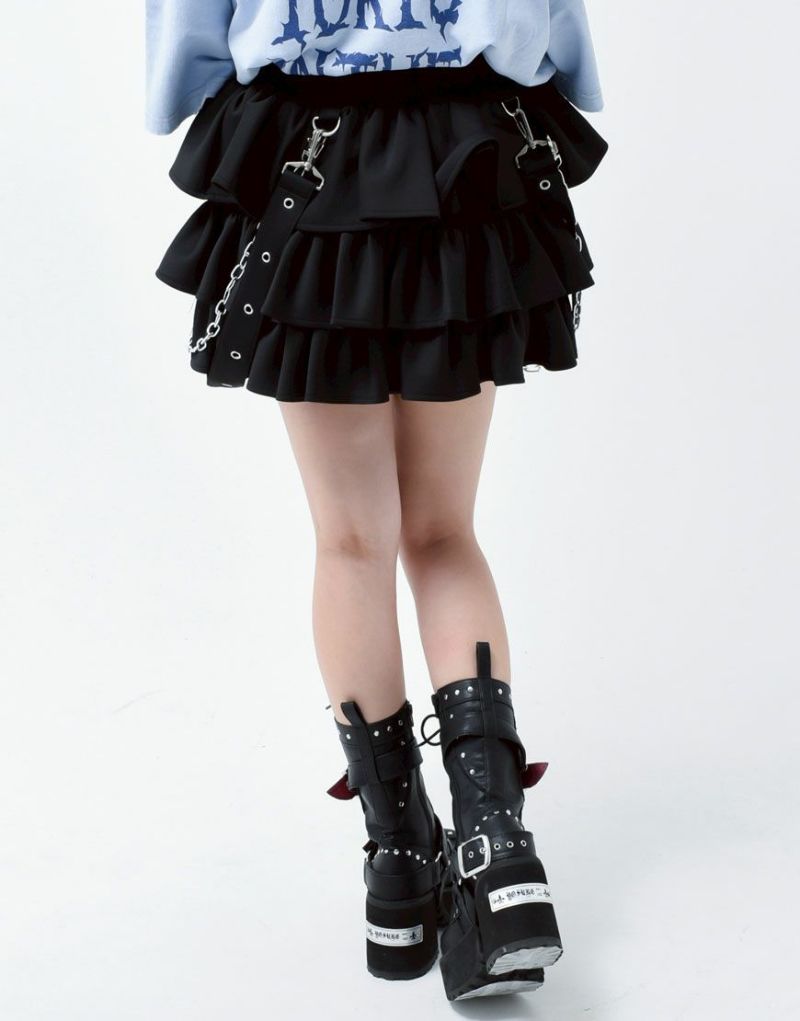 ボリューム感のあるティアードフリルに、ハードな印象のチェーン付きサスペンダーを組み合わせた、他にはないデザイン。サスペンダーとチェーンは取り外し可能で、スタイリングの幅が広がります。