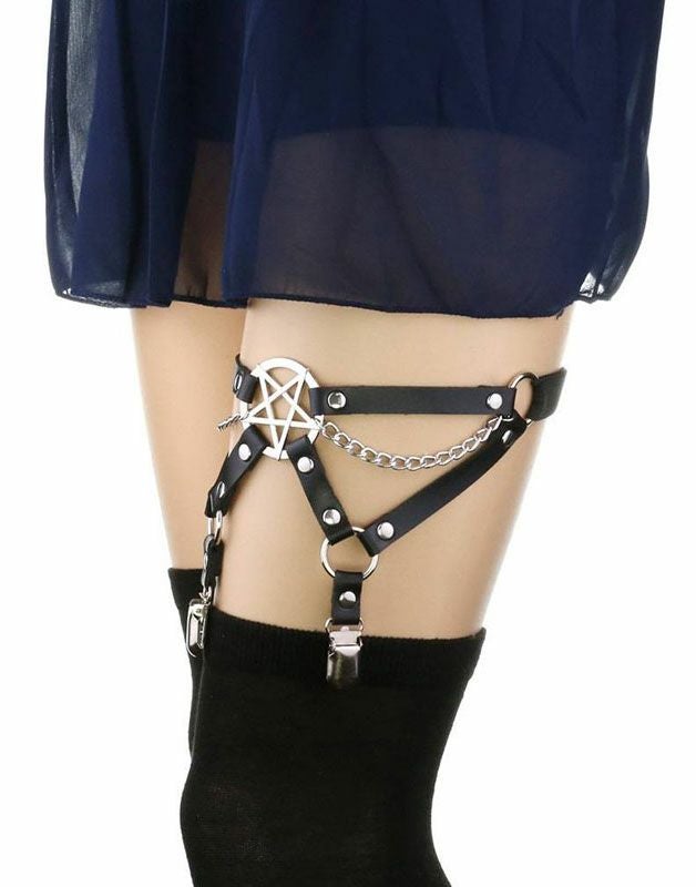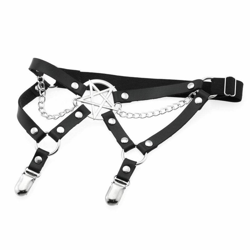 NOVESSELから五芒星ガーターベルトが登場しました。 PUレザー素材に五芒星バックルのガーター付きベルト。 コーディネートのアクセント付けに服の上からの着用でスタイリングをグレードアップします。 ※モデル画像は照明などの影響により実際の商品と異なる場合がございます。