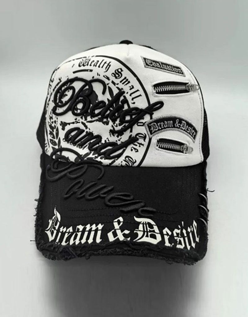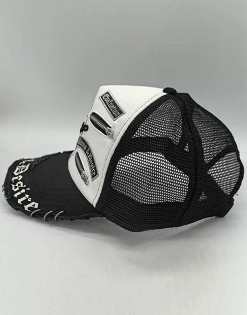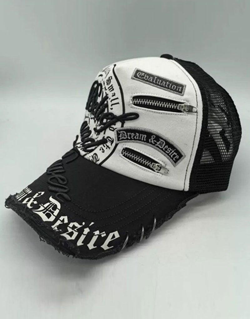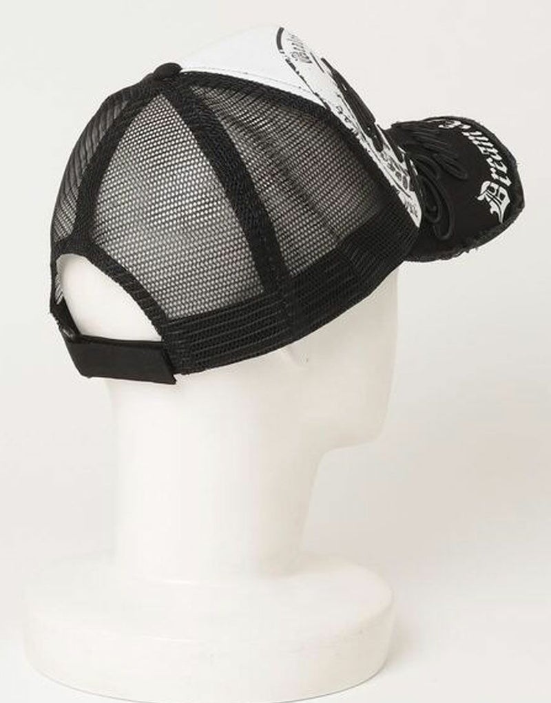 NOVESSEL【ノベセル】からデザインメッシュキャップが登場。オールドイングリッシュのアートワークが目をひくメッシュキャップ。 リングピアスやジッパー仕様など細部のディティールにも拘ったトレンドアイテムです。 ユニセックスとしても着用可能です。 ※モデル画像は照明などの影響により実際の商品と異なる場合がございます。