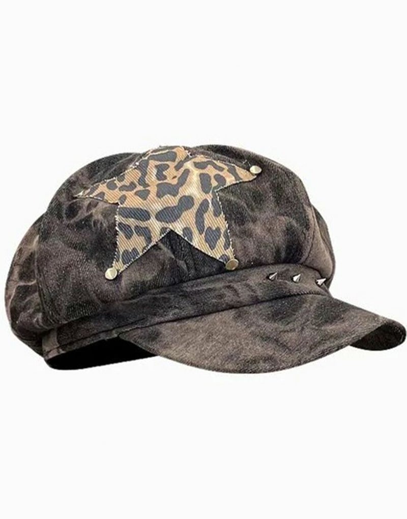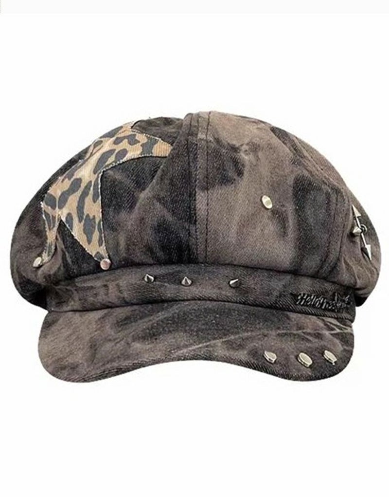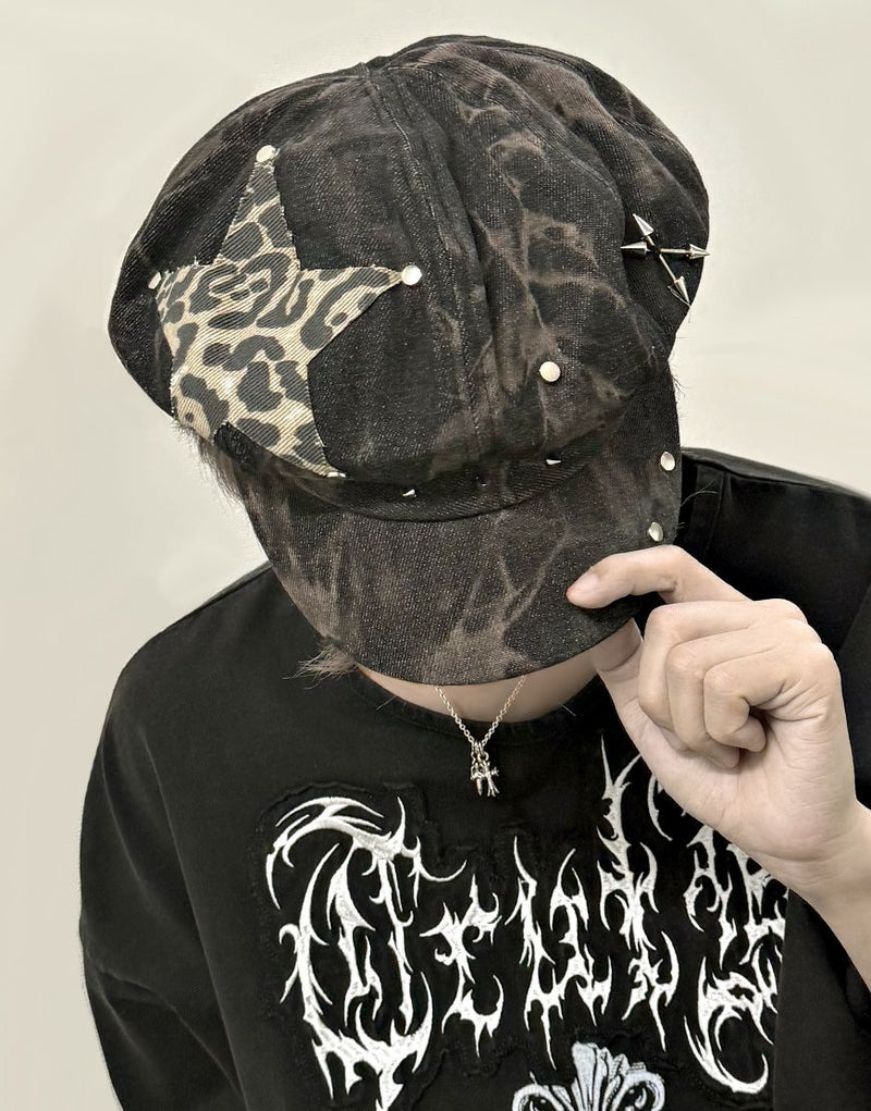 レオパード柄のスターパッチワークデザインが目をひくデニムキャスケット。
