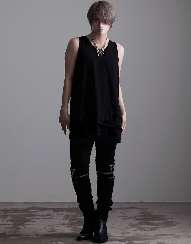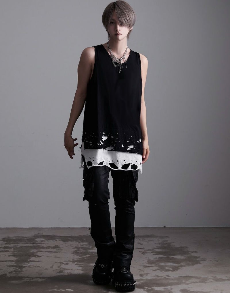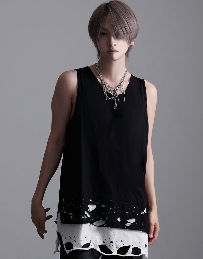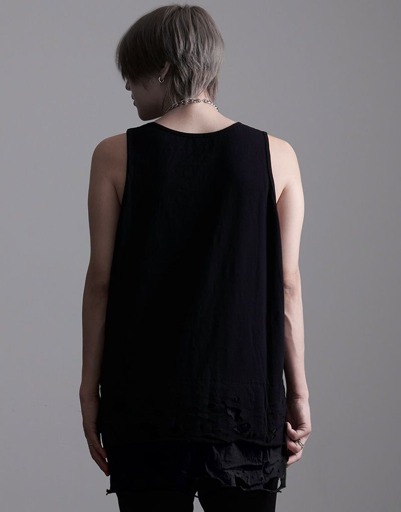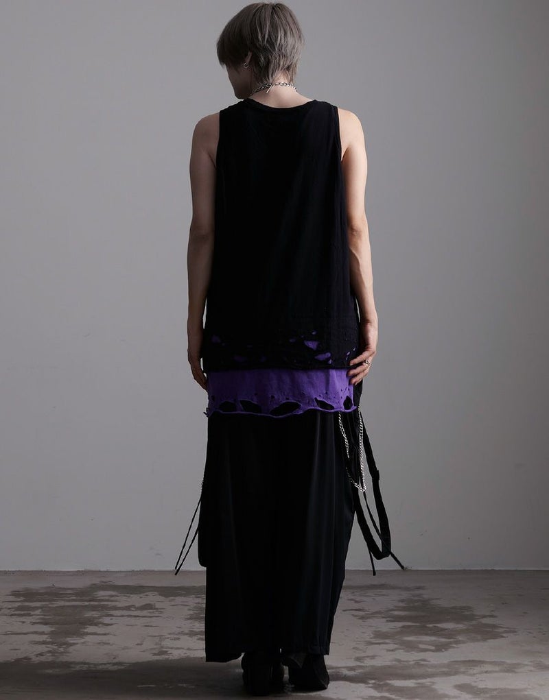 裾のレイヤード部分にオパール加工によるダメージを施したオーバーサイズのロングタンクです。