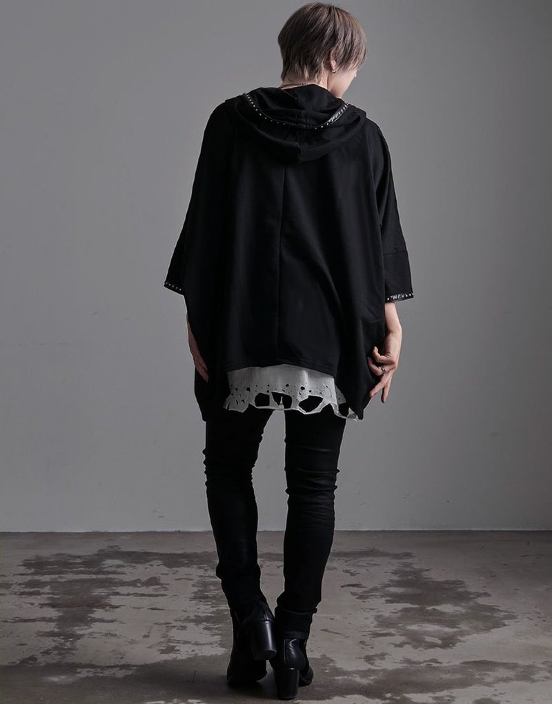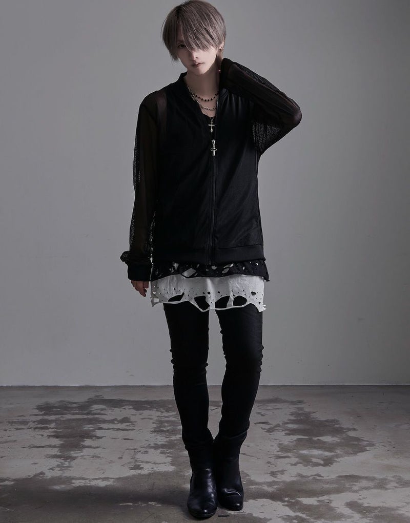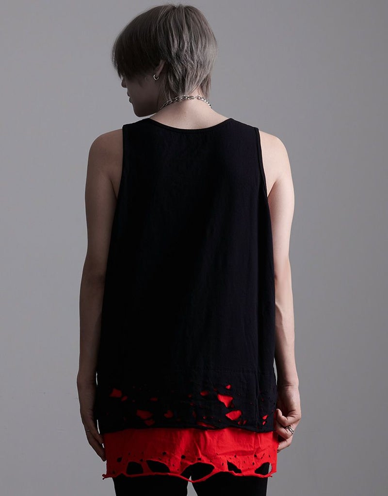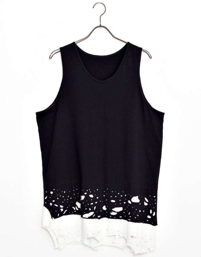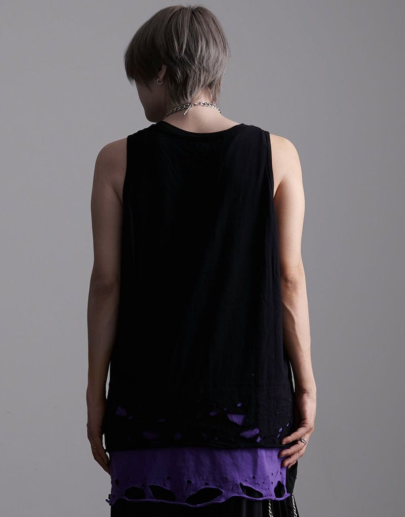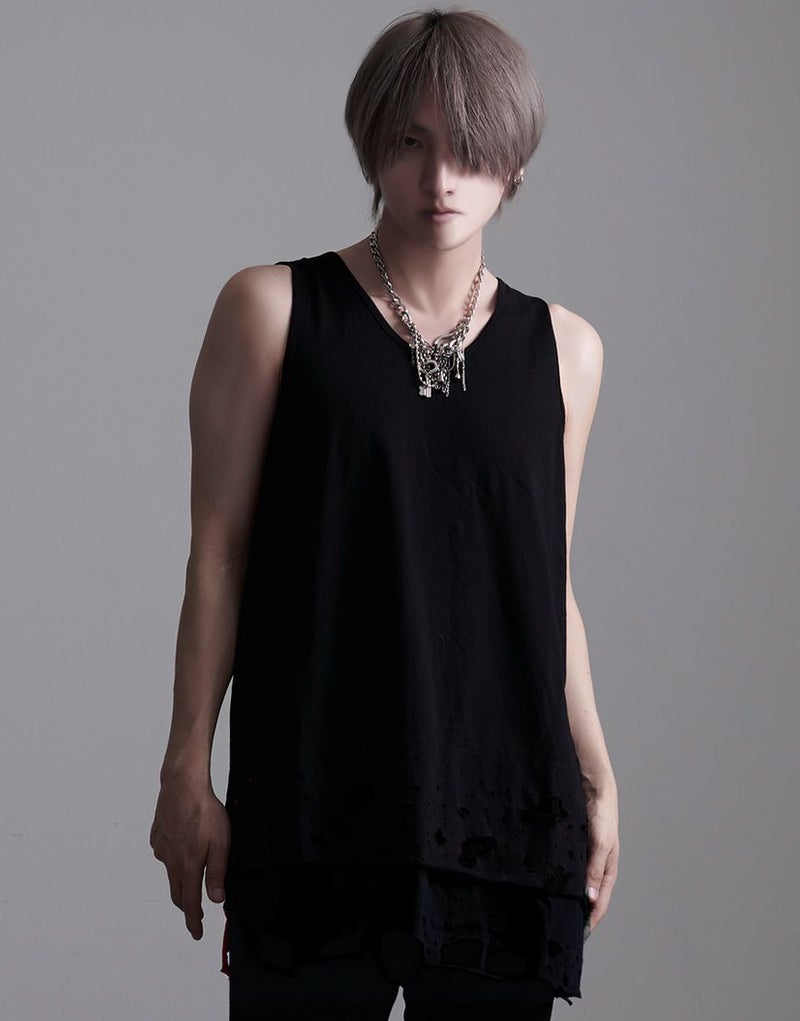 裾のレイヤード部分にオパール加工によるダメージを施したオーバーサイズのロングタンクです。