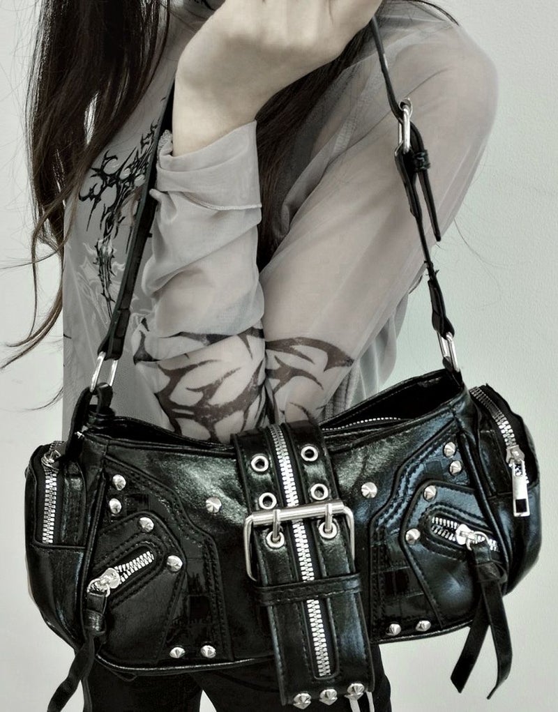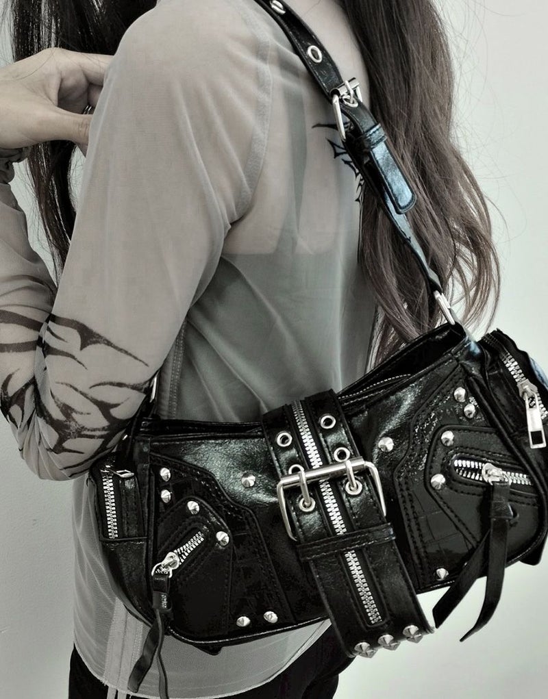 NOVESSEL【ノベセル】2wayベルトスタッズデザインハンドバッグが登場。小ぶりなフォルムが可愛いハンドバッグ。各所に配置されたスタッズにギミックファスナー付きのベルト、型押しのクロコ柄など、装飾されたデザインがコーデの中に存在感を醸す闇かわ地雷バッグ。連結できるベルトがもう1本付くので2wayでショルダーバッグとしても使用できます。マチも広く取り、両サイドポケット付きなので使い勝手の良さも魅力となっています。 ※モデル画像は照明などの影響により実際の商品と異なる場合がございます。