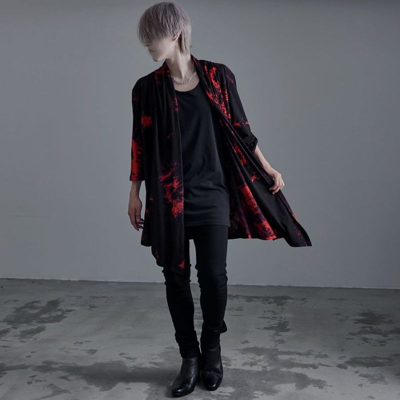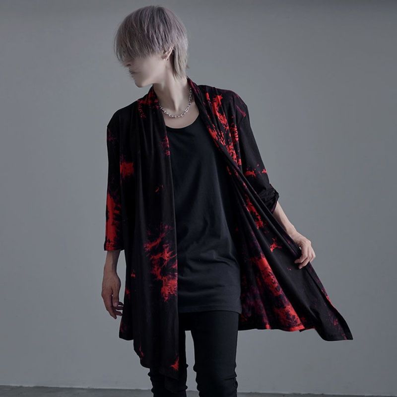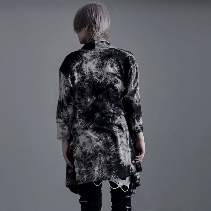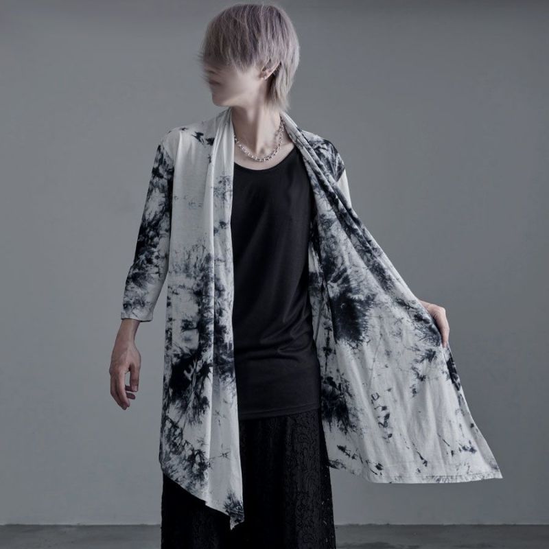 ムラ染めデザインが総柄で描かれたダークな雰囲気のドレープカーディガンです。