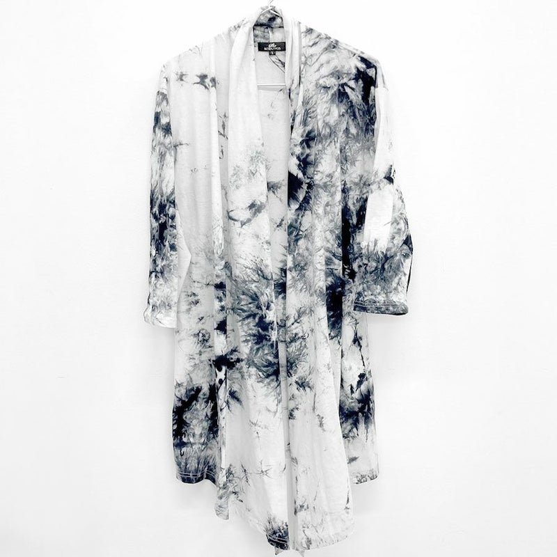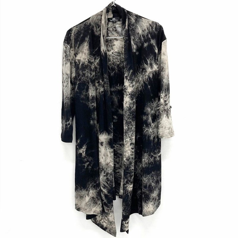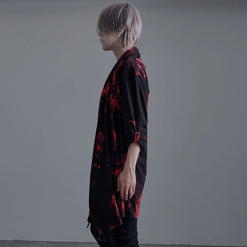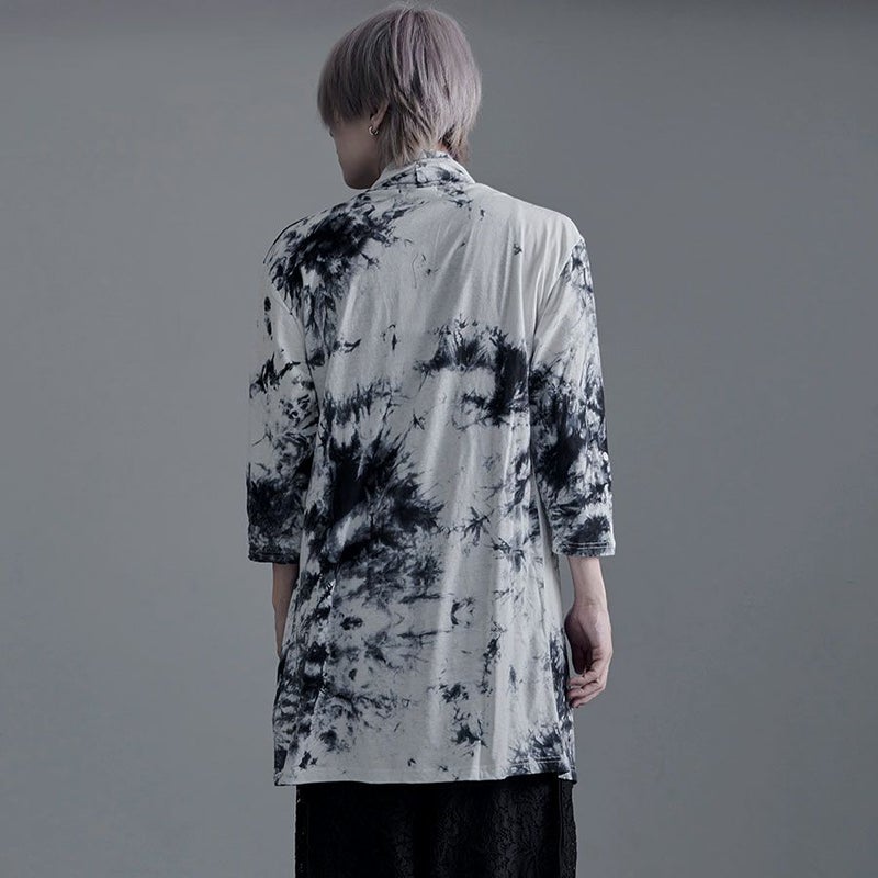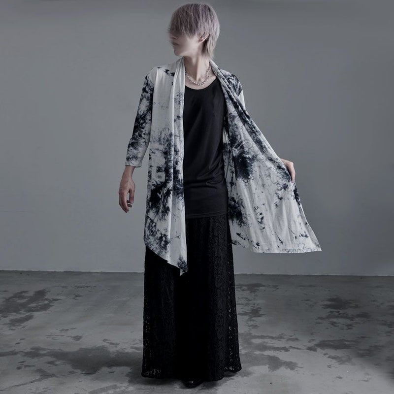 ムラ染めデザインが総柄で描かれたダークな雰囲気のドレープカーディガンです。