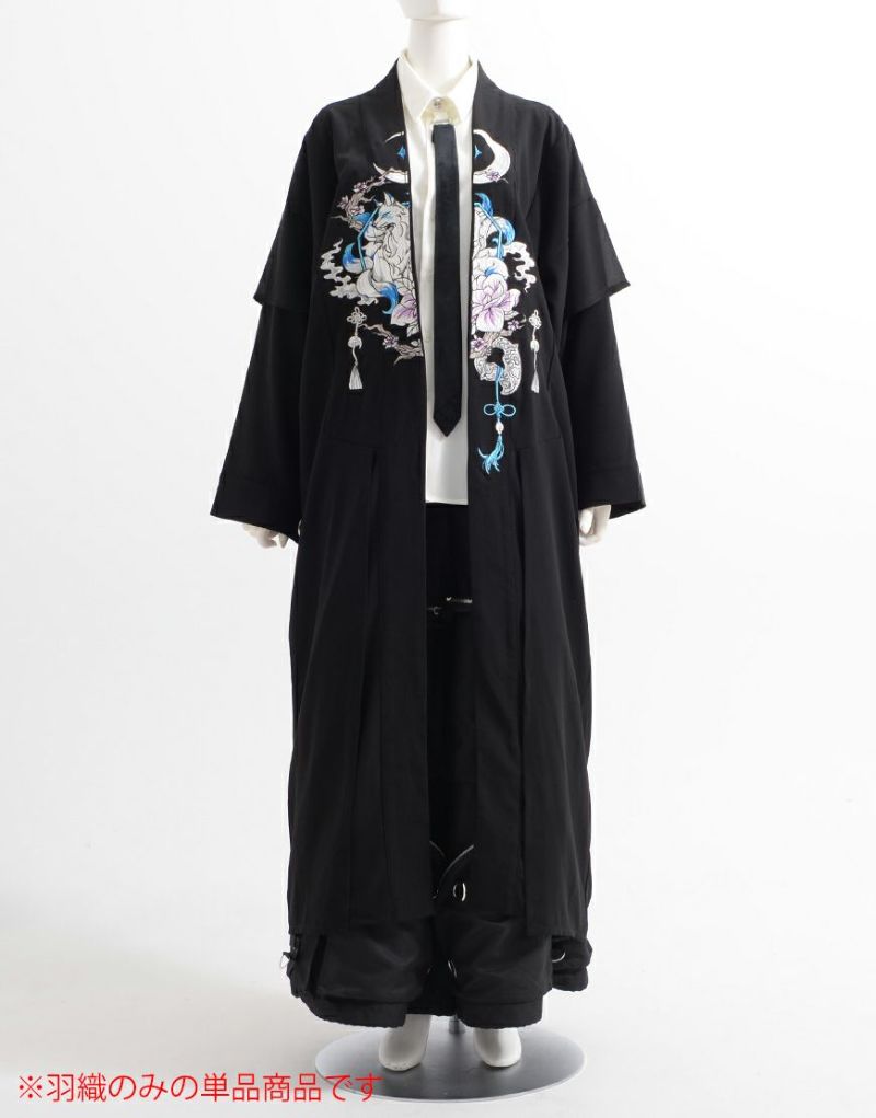 ilililより【月影妖尾】ロング羽織が登場です。 フロントに迫力のある九尾の刺繍が施された和風のロング羽織です。 着物風のシルエットが特徴的で、シフォン生地とのフェイクレイヤードが魅力的です。 袖口には、ハトメにタッセルがあしらわれたデザインが施されています。 和装としてはもちろん、モードなコーディネートにもぴったりな一枚。 高級感のある生地感で仕上げ、 シンプルだからこそ生地や質感に拘りたい方に贈るアイテム。