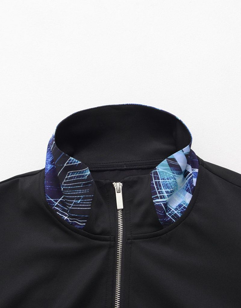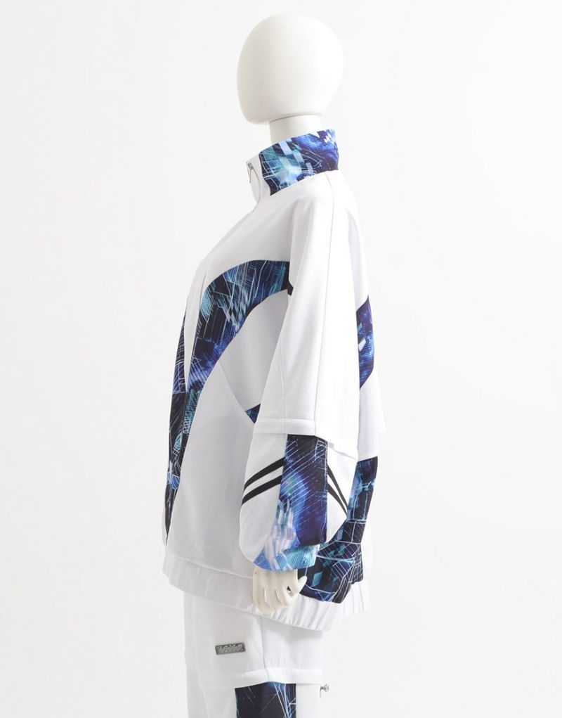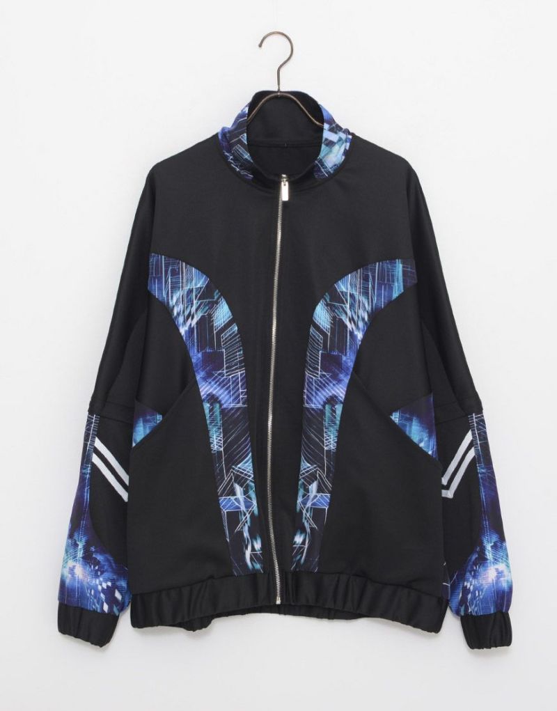 ブルーのグラフィック切替が目を引く、ジップ仕様のジャージトップス。