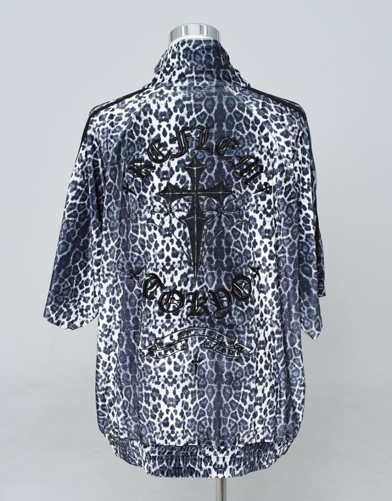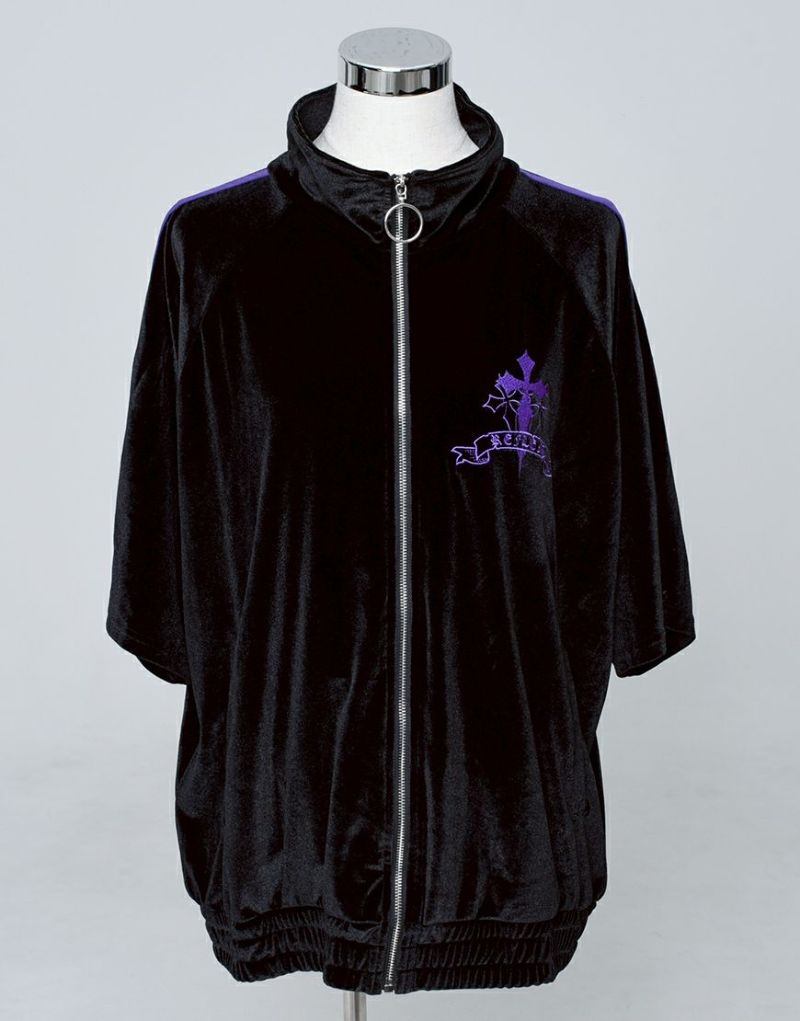 袖には定番のジャージ生地を使った2本ラインを別布で切り替え、スポーティーさとゴシックテイストを融合したデザインに仕上げました。
