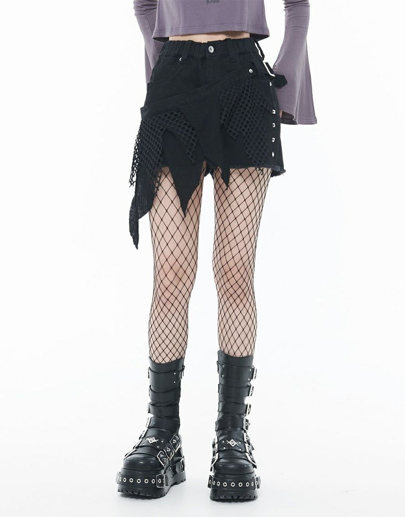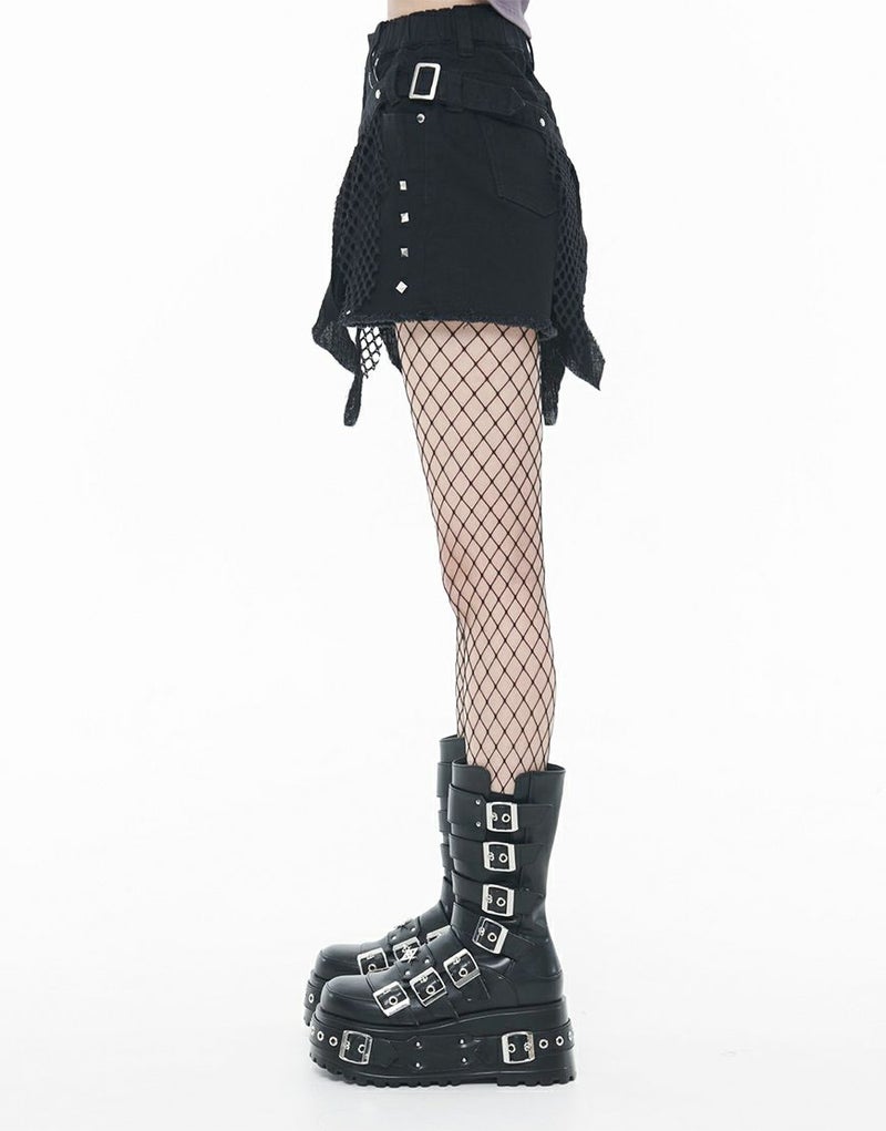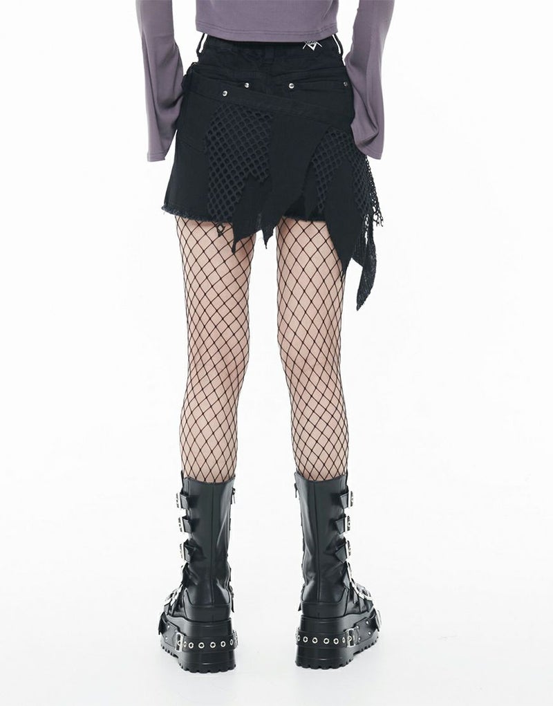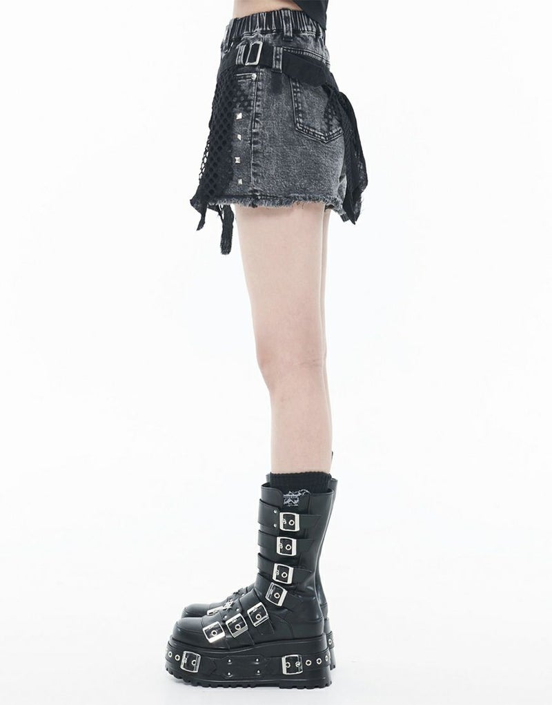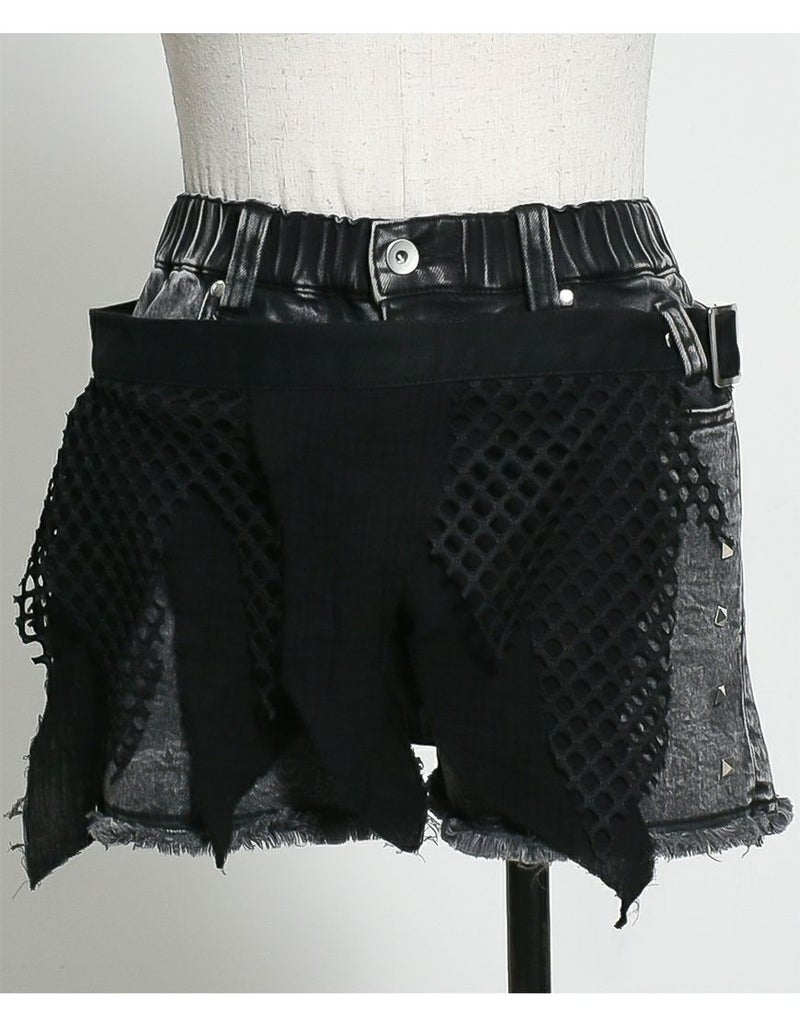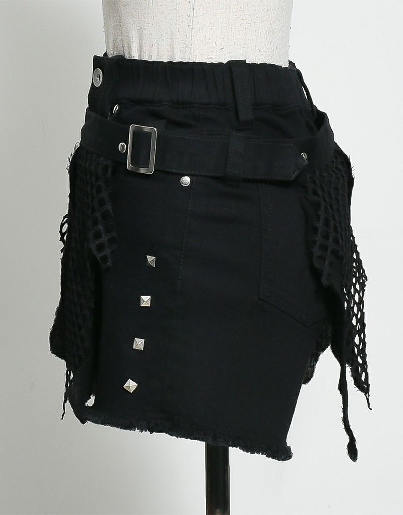 ストレッチ混のブラックデニム素材を使用したショートパンツとグランジテイストのデザインを施したベルトの2Pセットです。