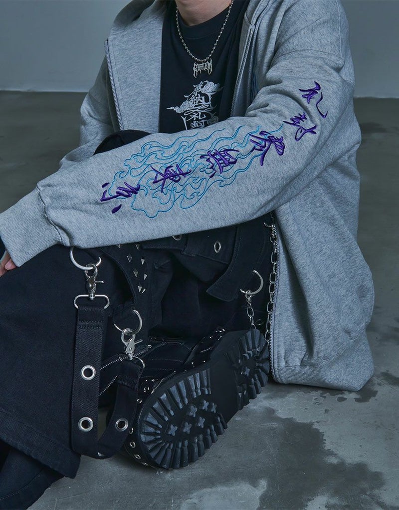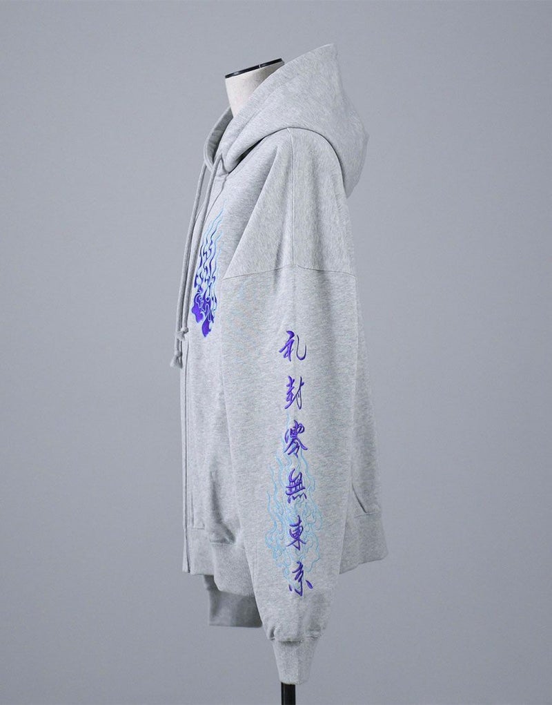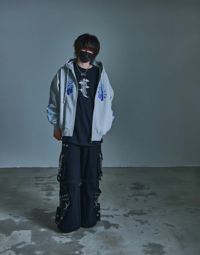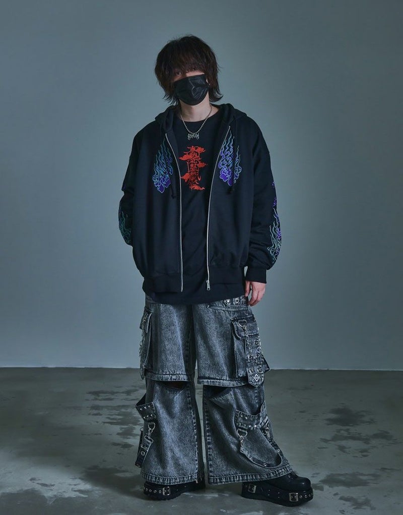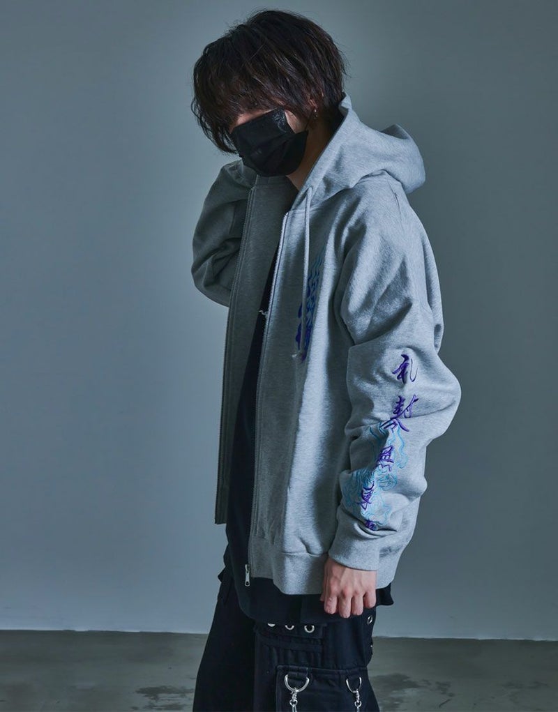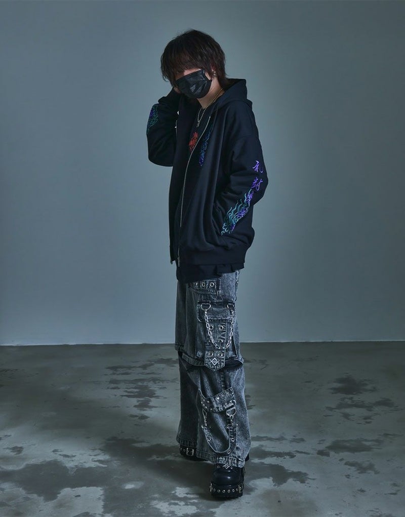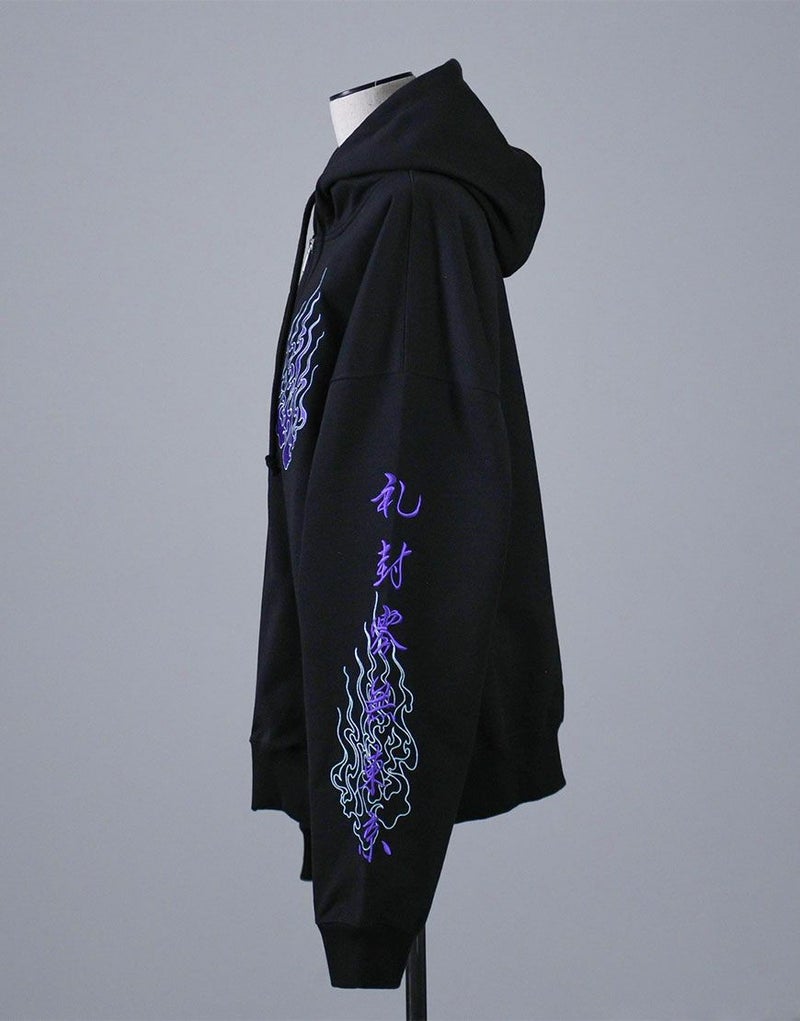 漢字ロゴや炎で計5カ所に刺繍を入れてオリエンタルな雰囲気を表現しました。