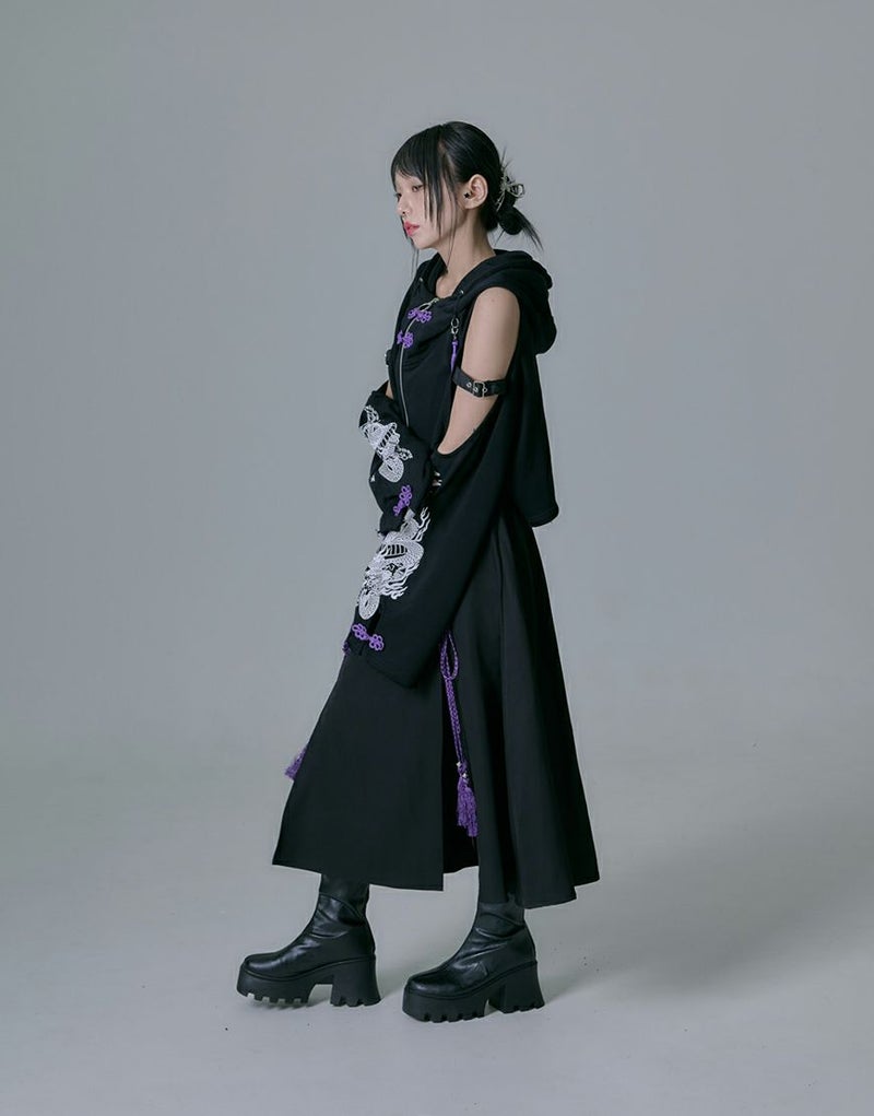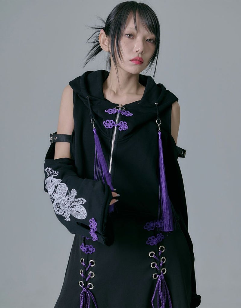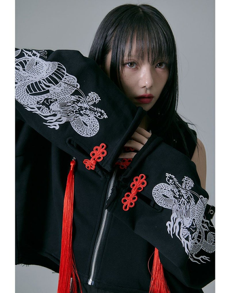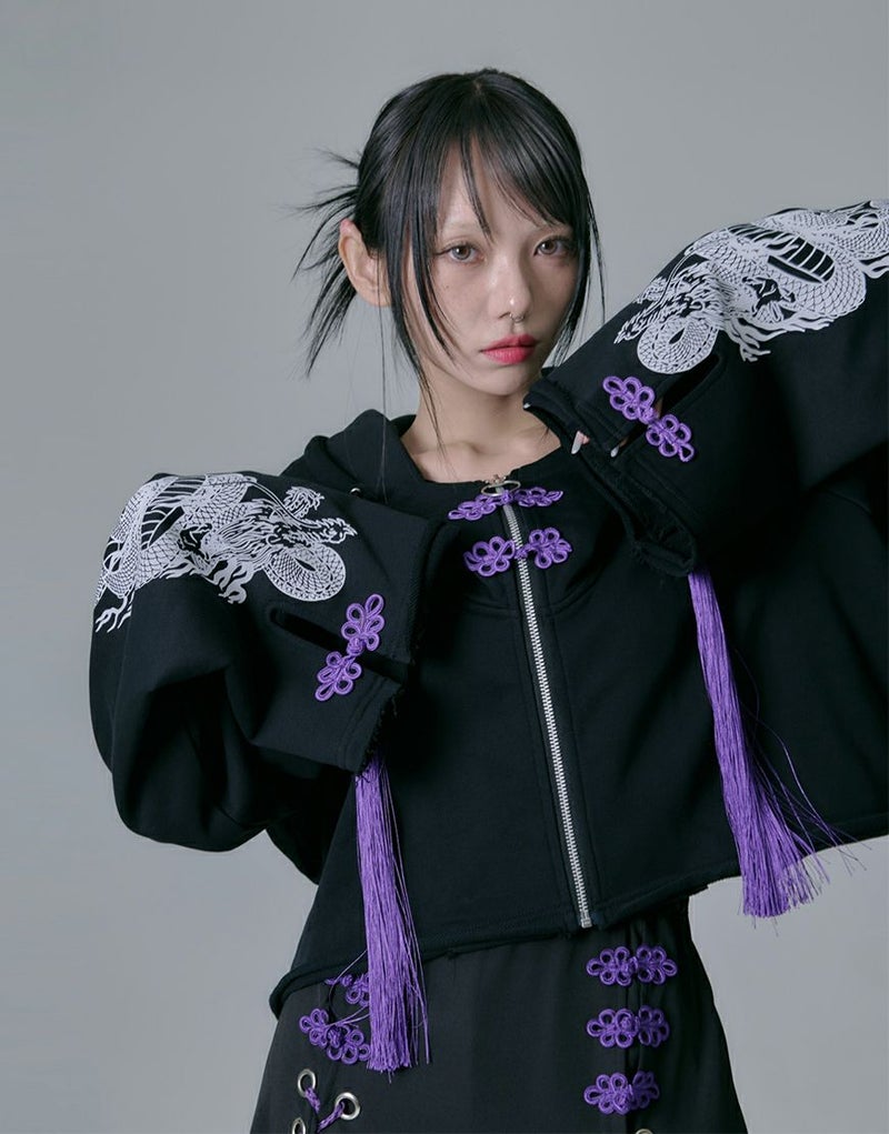 チャイナ風デザインの飾りボタンとタッセルを使用したクロップド丈のジップパーカー。