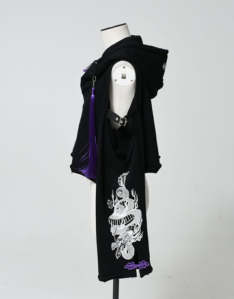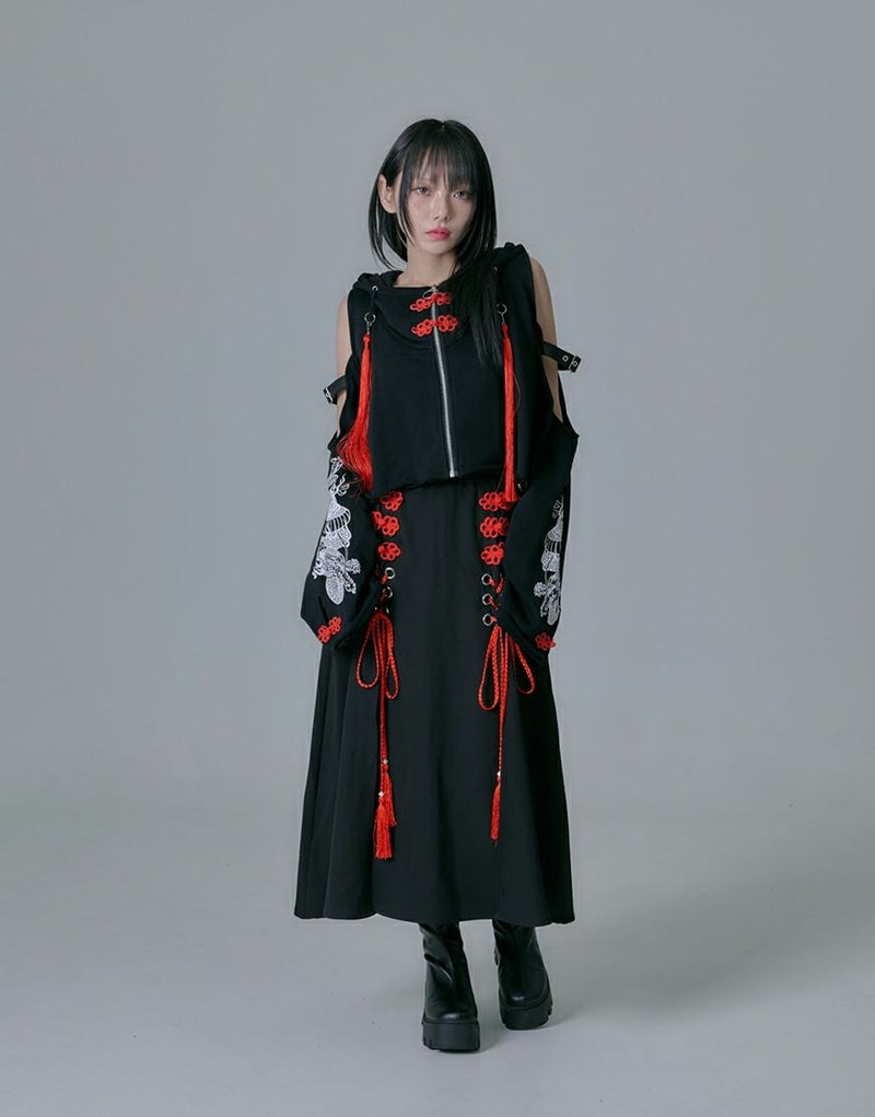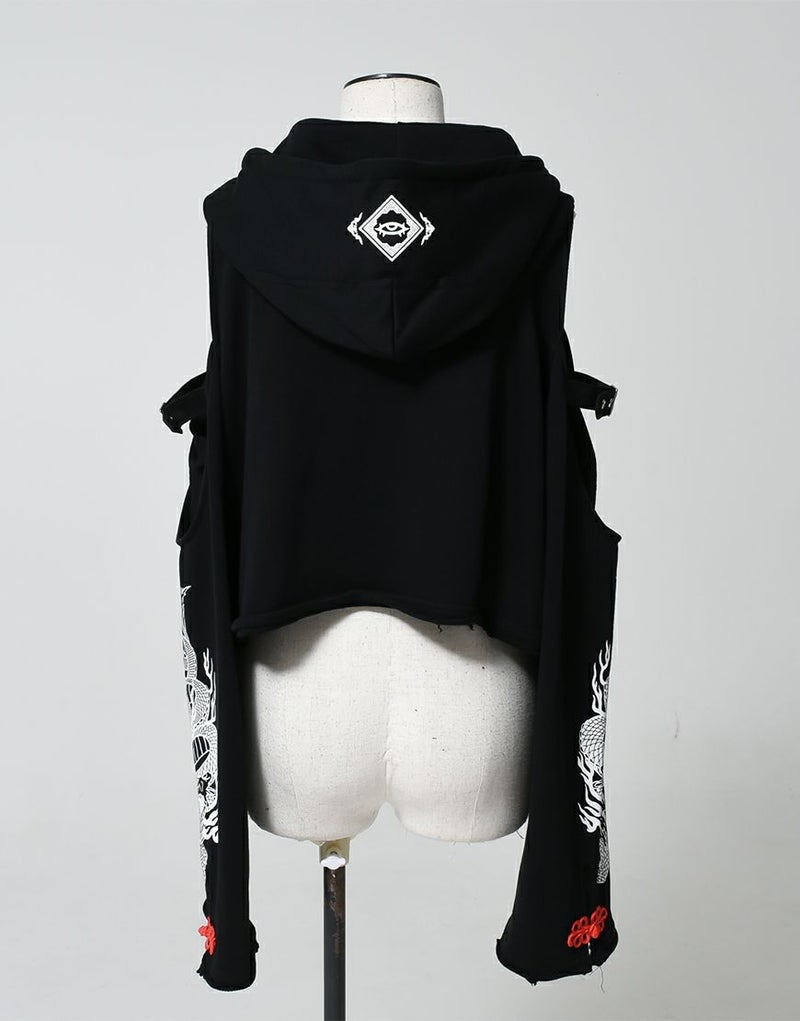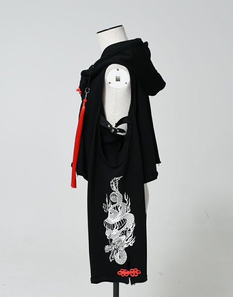 チャイナ風デザインの飾りボタンとタッセルを使用したクロップド丈のジップパーカー。