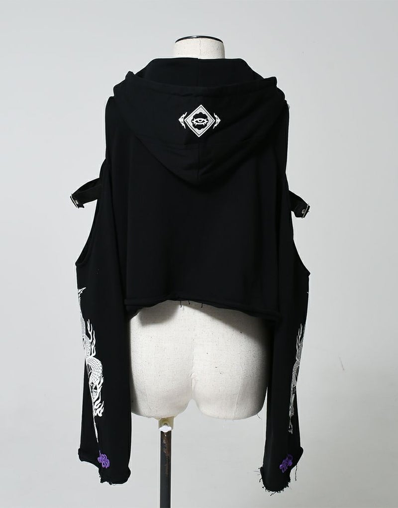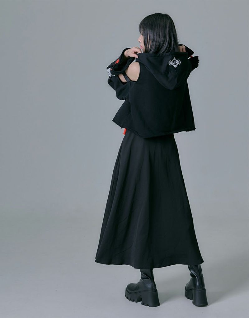 カットオフ仕様の袖口と裾に、ショルダー部分は大きくカットした斬新なデザインが魅力を引き立てます。
