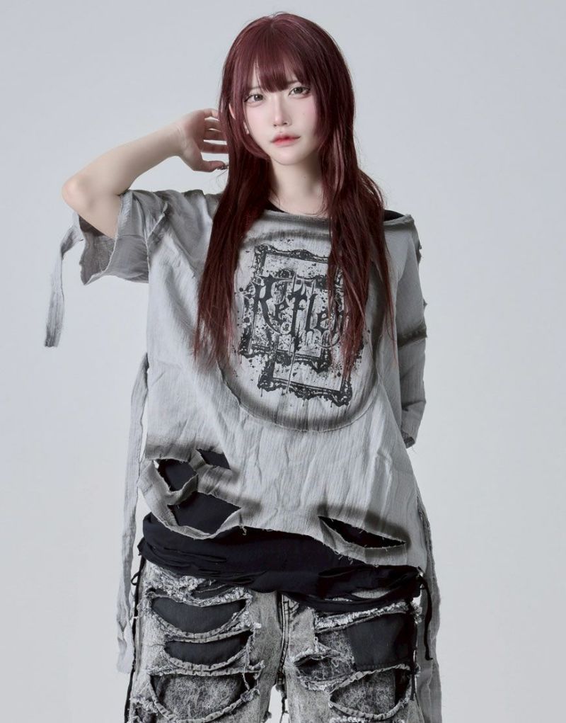 グラフィックはプリント仕様、ボディ部分には部分ダメージ加工&スプレー加工でグランジな雰囲気を引き立てます。