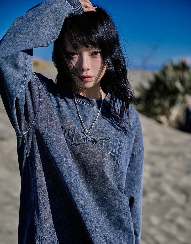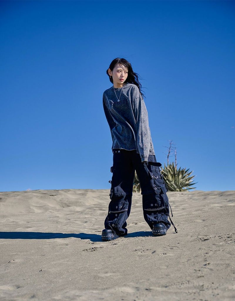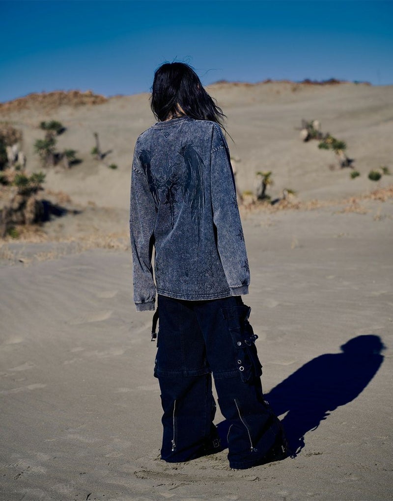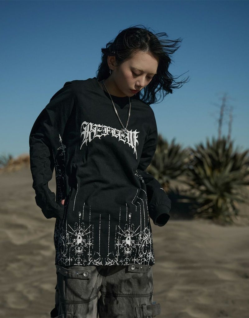 フロント、バック、袖にロゴやゴシックテイストのクロス、翼のプリントでダークな雰囲気を演出したインパクトある長袖Tシャツです。