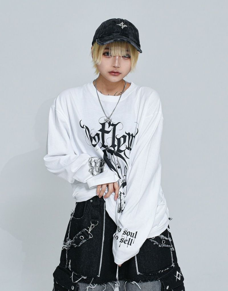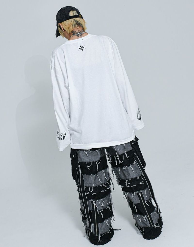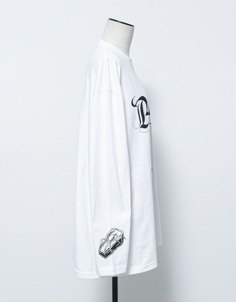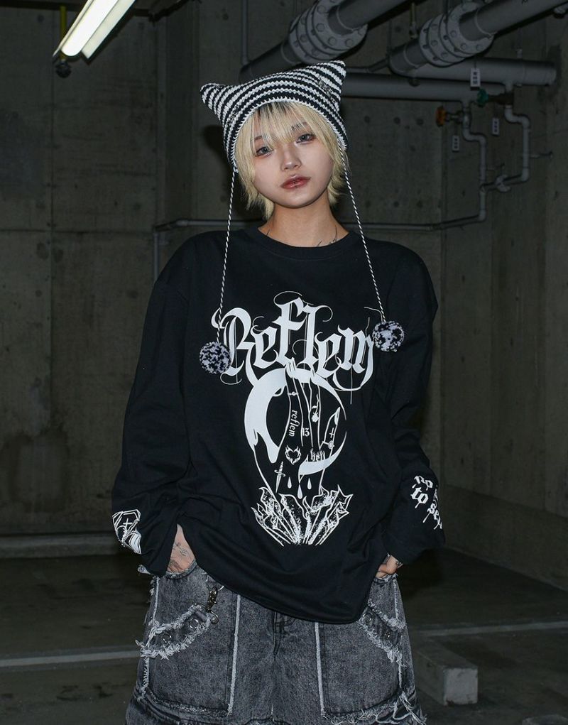 タトゥーが施された手に三日月が刺さっているという斬新なグラフィックをフロントにプリントしたビッグシルエットの長袖Tシャツ。
