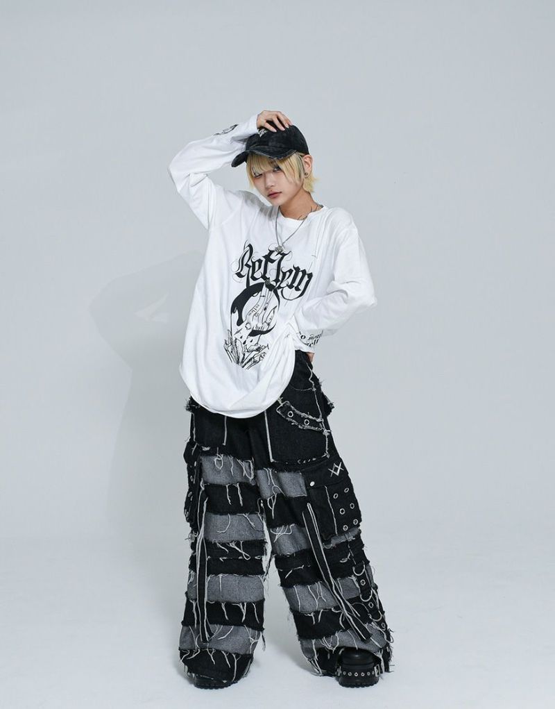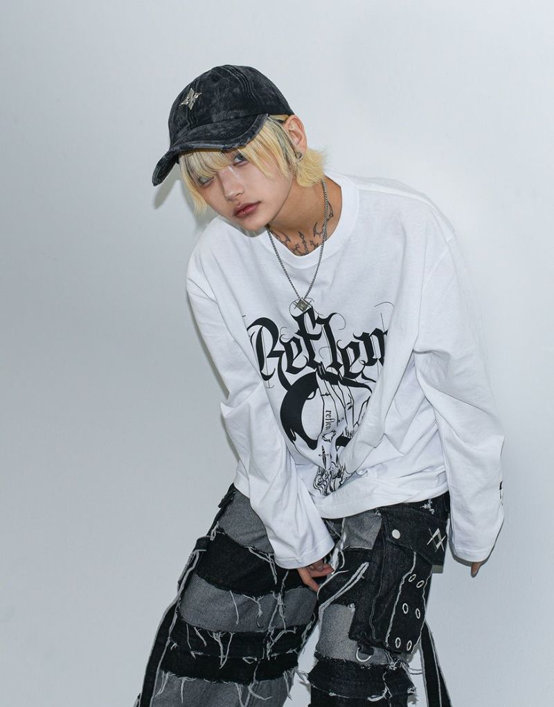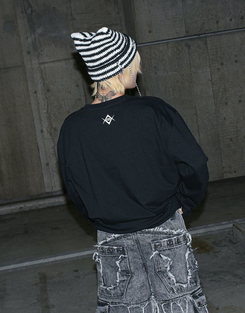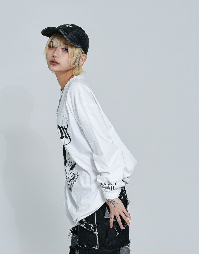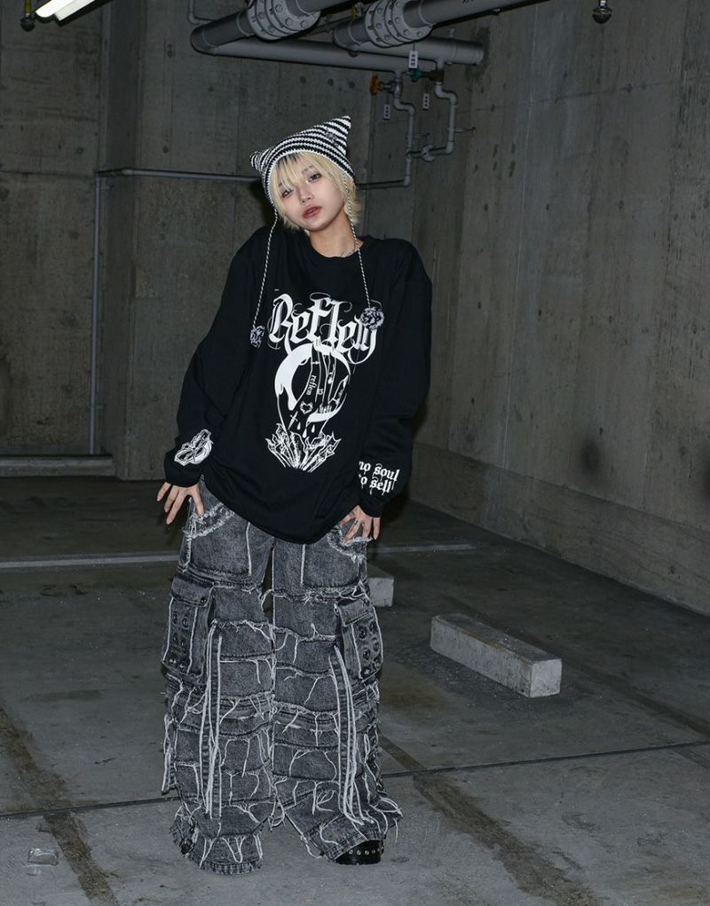 タトゥーが施された手に三日月が刺さっているという斬新なグラフィックをフロントにプリントしたビッグシルエットの長袖Tシャツ。