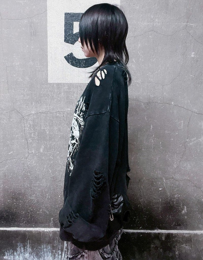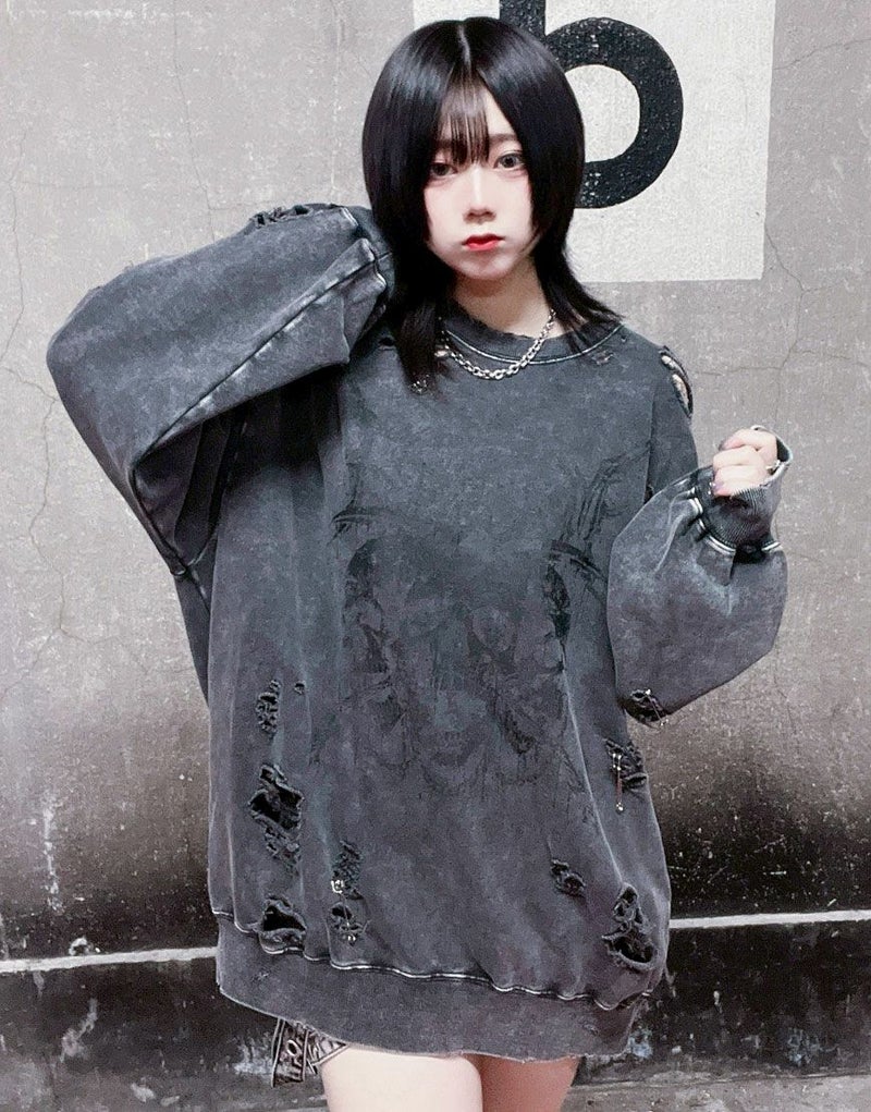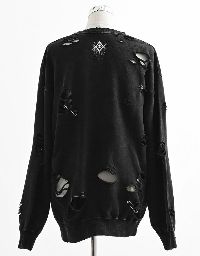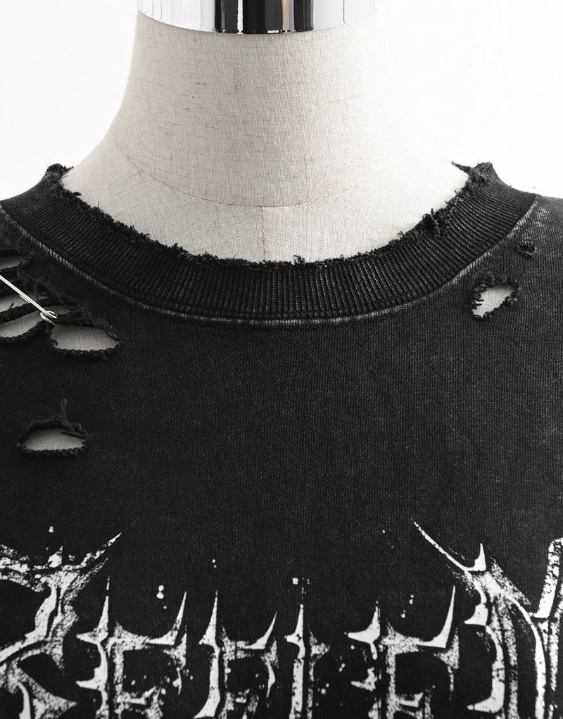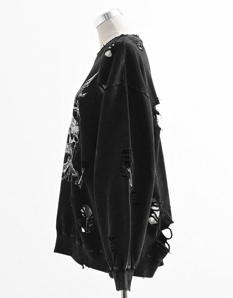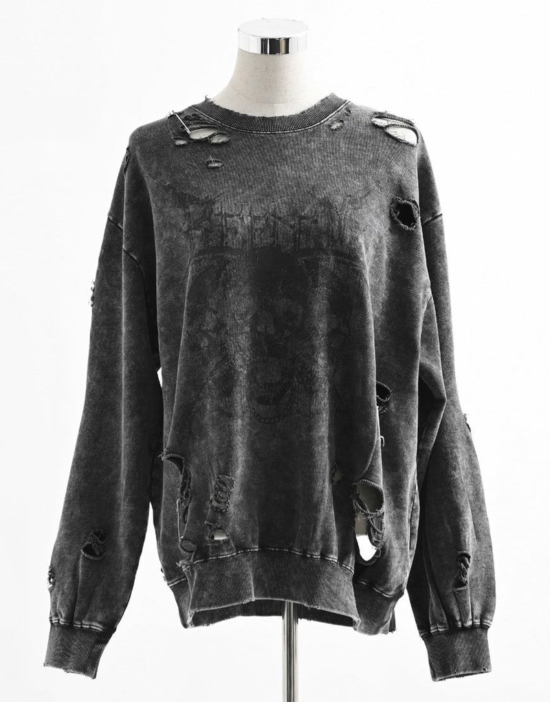 フロントに大迫力のスカルプリントを施した、REFLEMらしい退廃感漂うダメージスウェット。