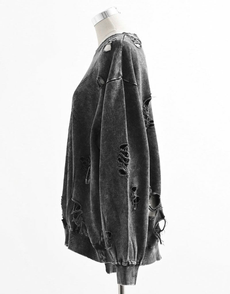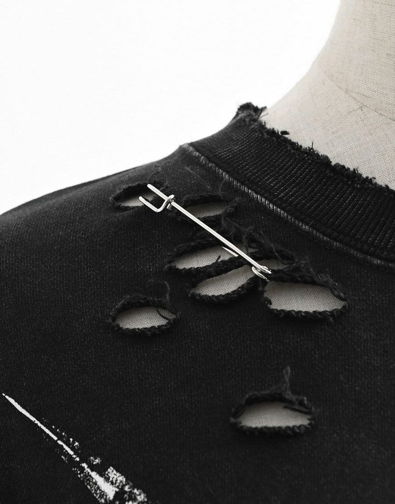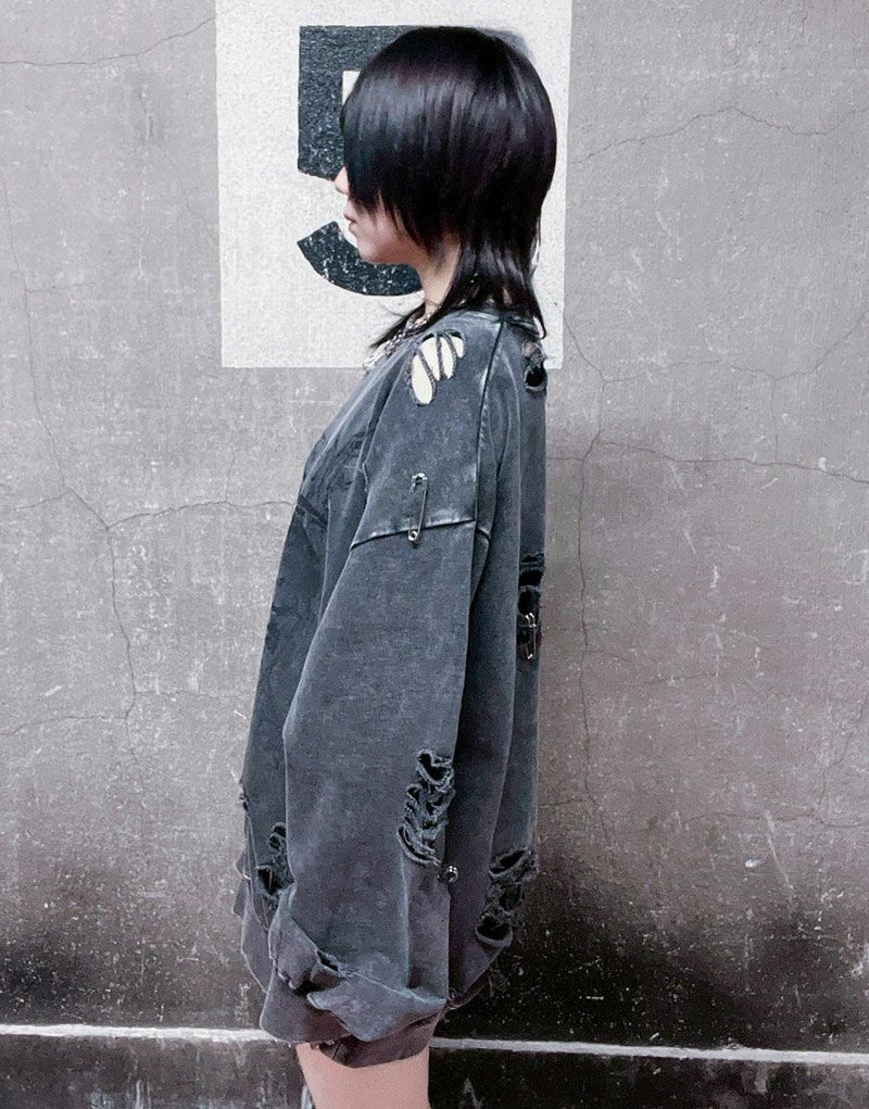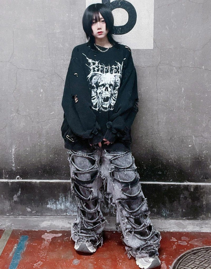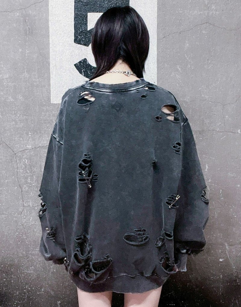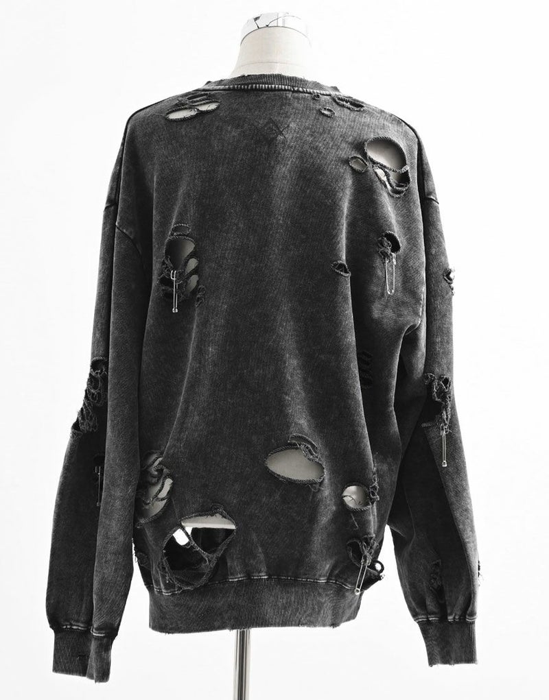 フロントに大迫力のスカルプリントを施した、REFLEMらしい退廃感漂うダメージスウェット。