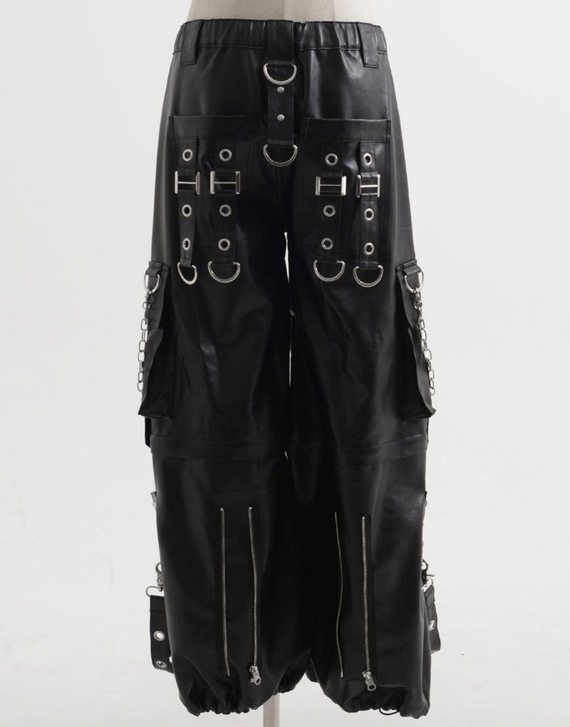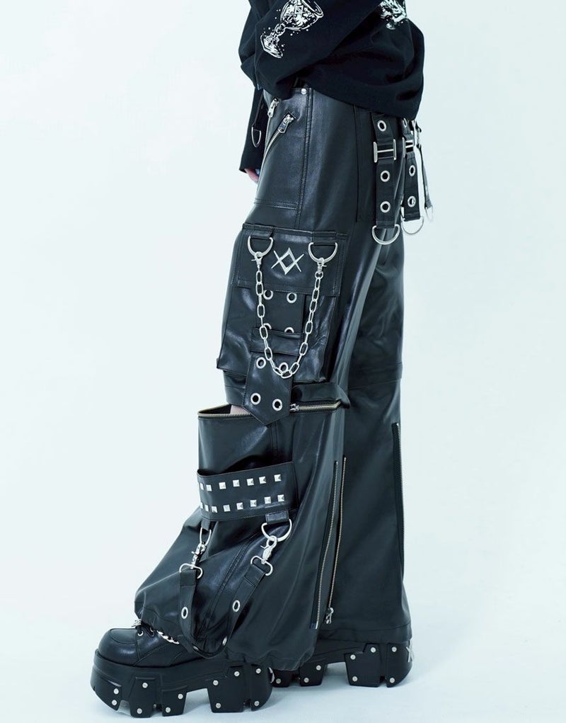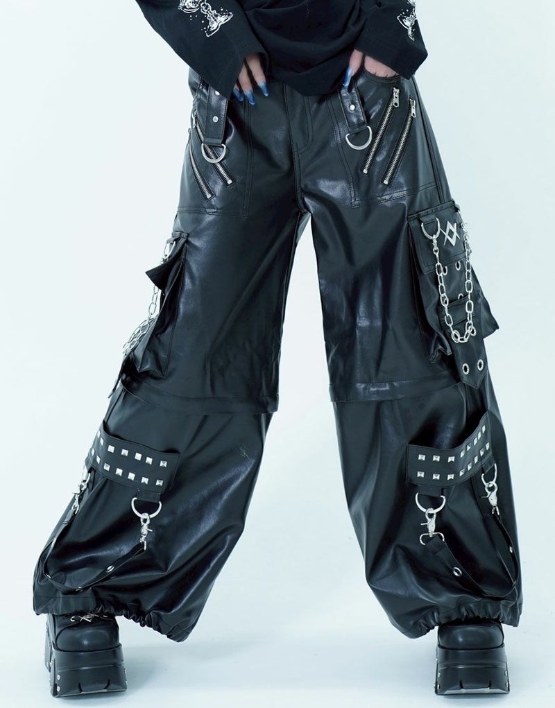 PUレザーを使用した存在感抜群のワイドシルエットボンテージパンツ。