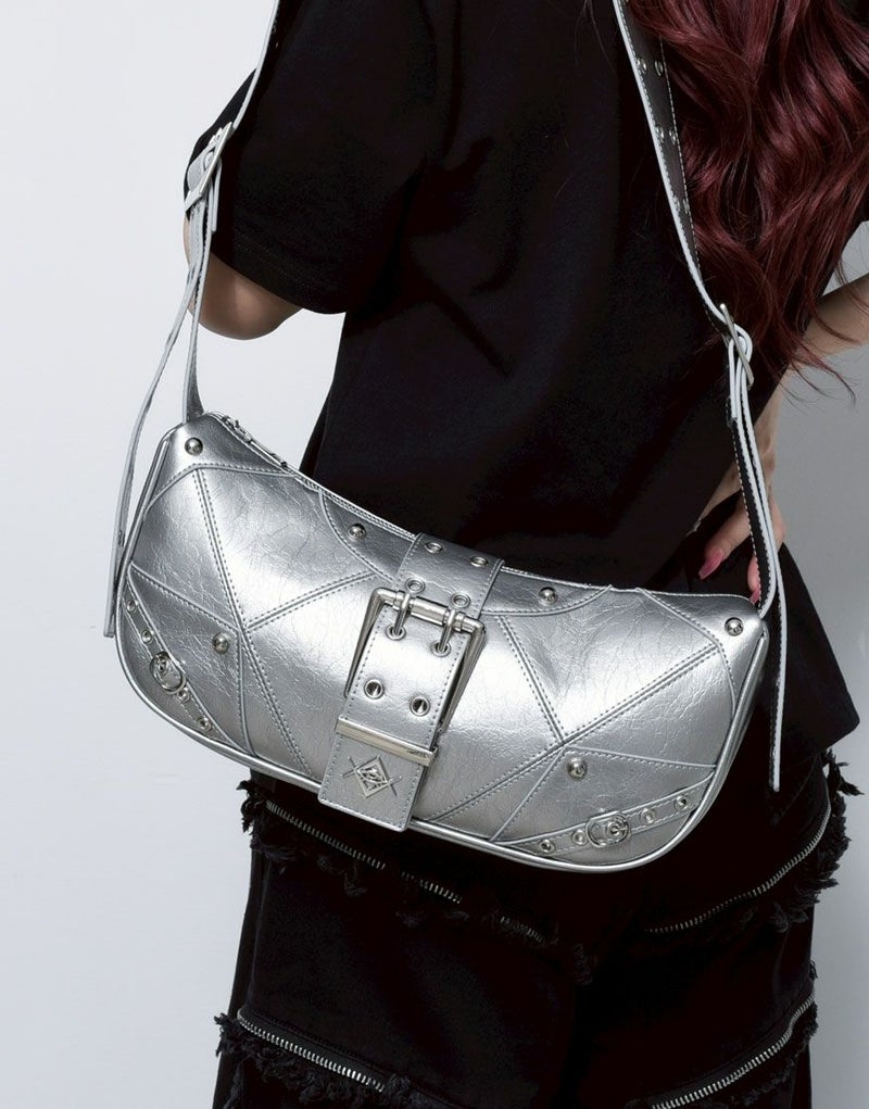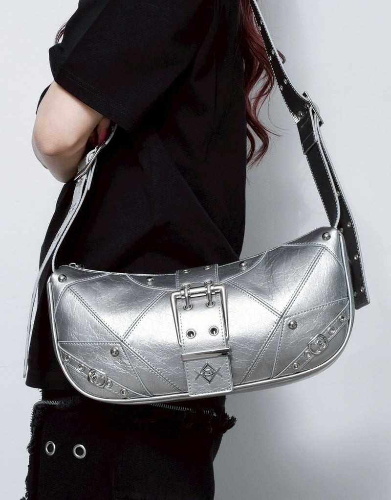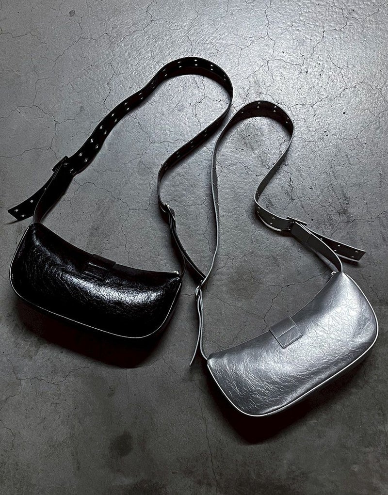 インパクトのあるハーフムーン型PUショルダーバッグ。