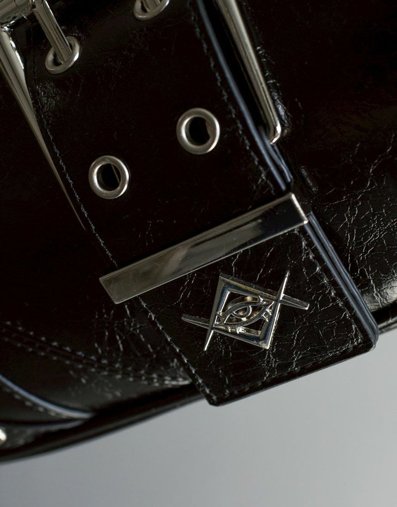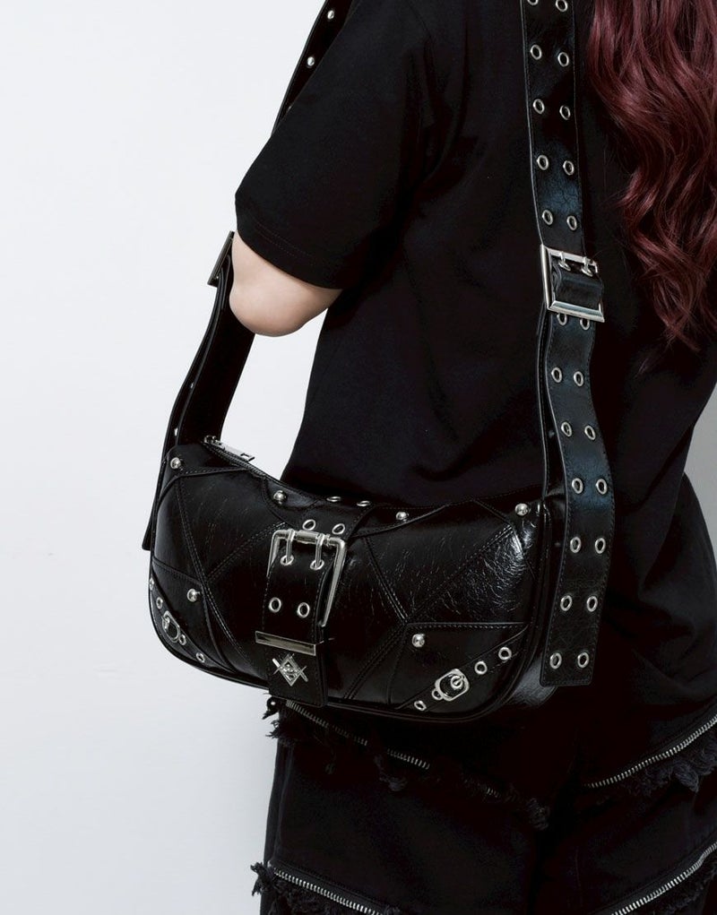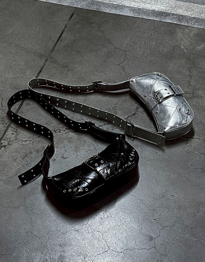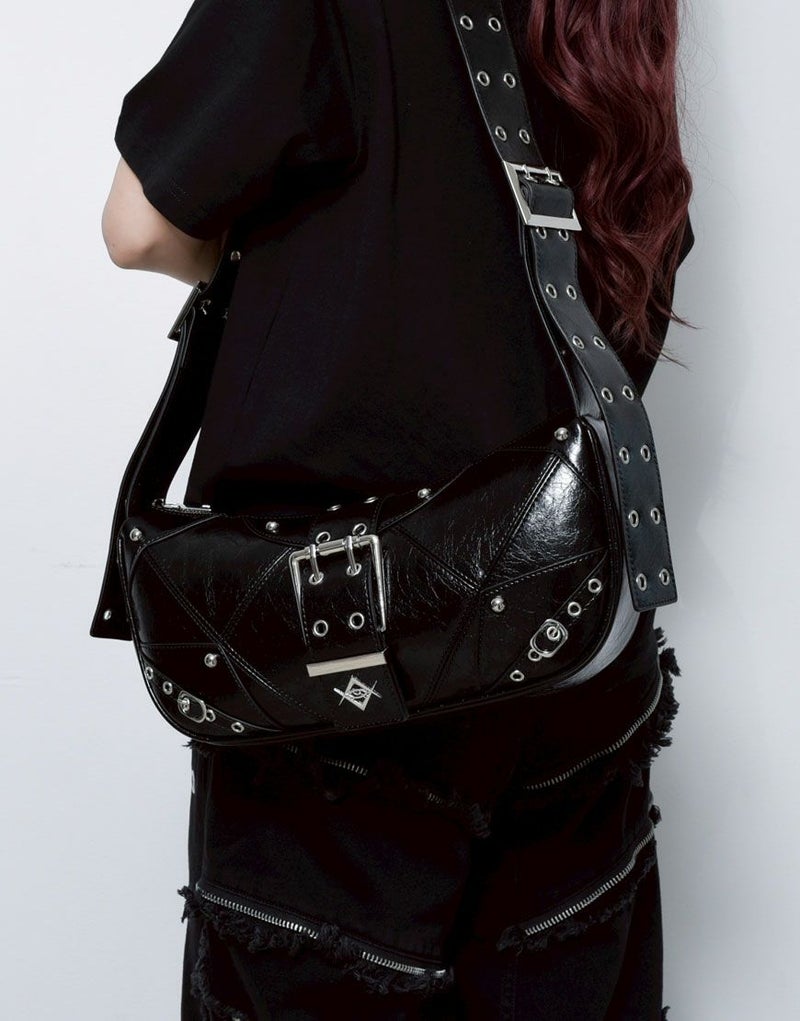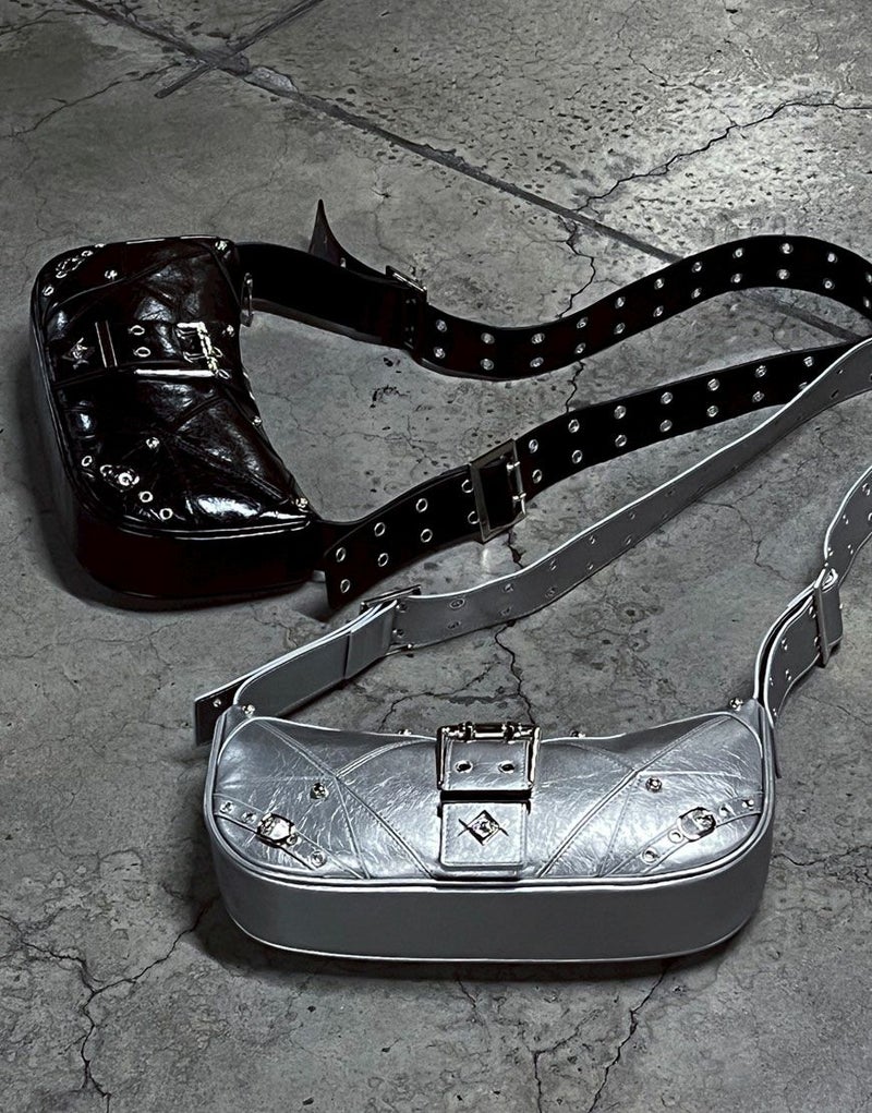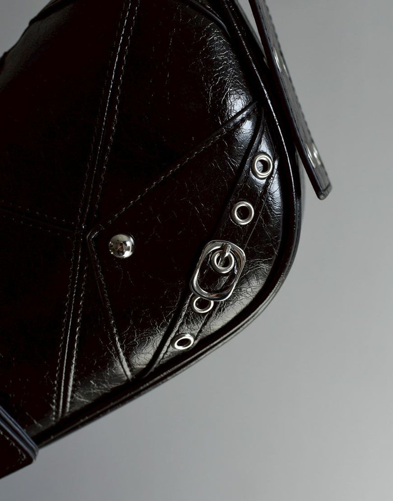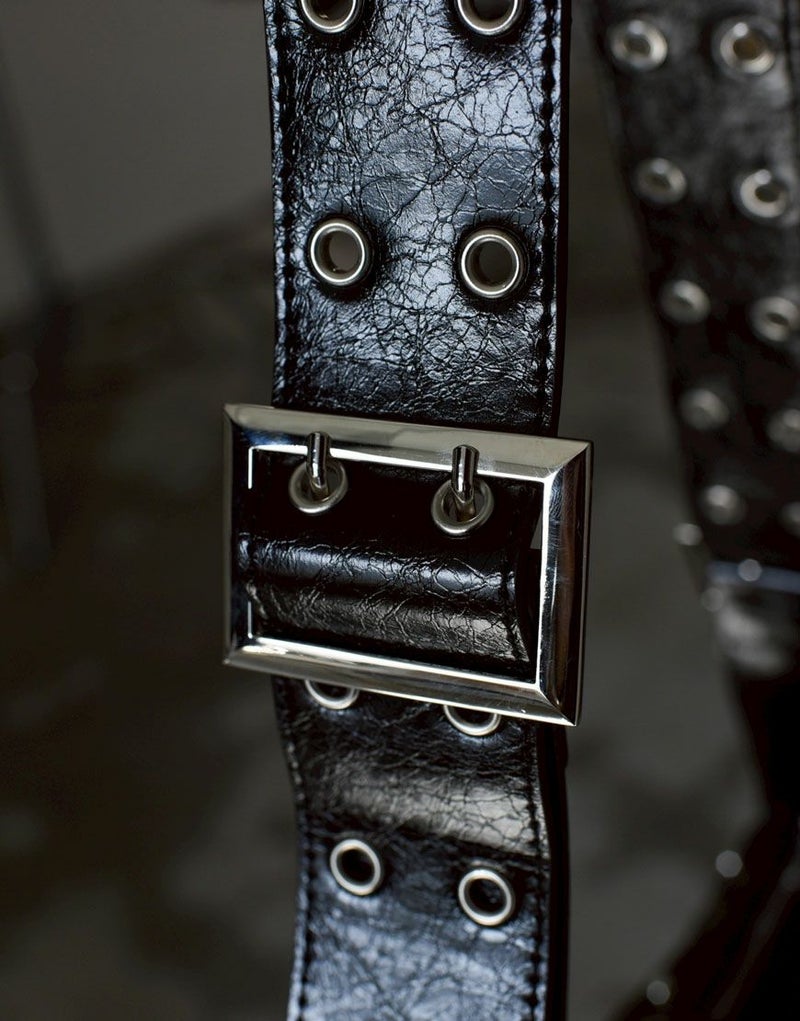 ワイドなショルダーベルトにはアイレットを打ち込み、細部までエッジの効いたデザインに。