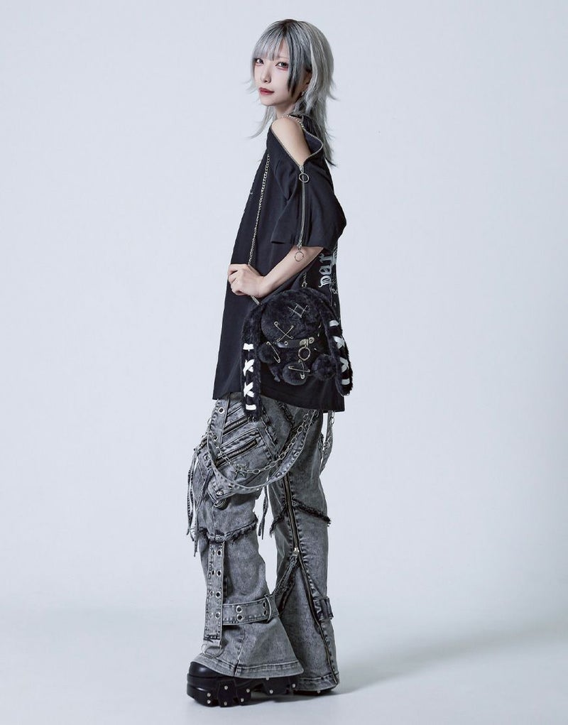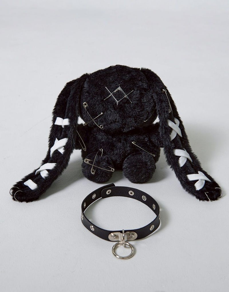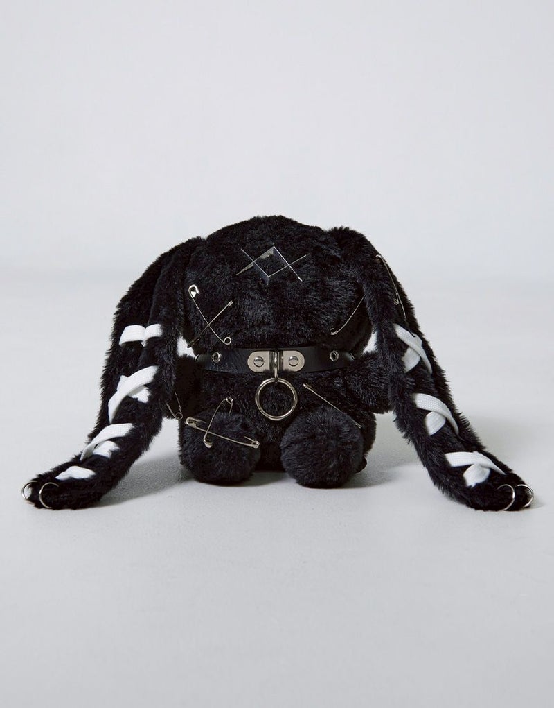 耳部分にはブランド定番の編み上げディテールを施し、さらに安全ピンや十字ステッチ、ロゴ入りリベットなど、細部にまで遊び心を詰め込みました。首元にはレザー調チョーカーを巻き、地雷系やY2K、サブカル系のコーデとも相性抜群。