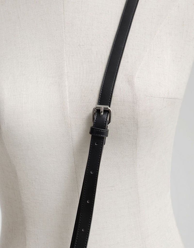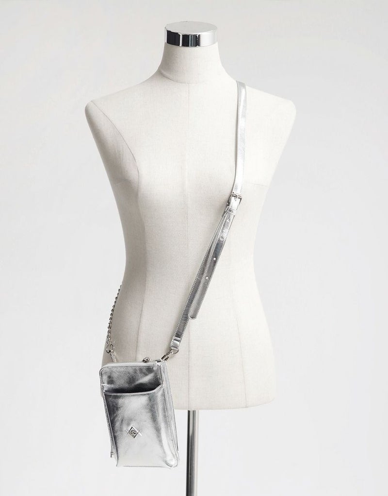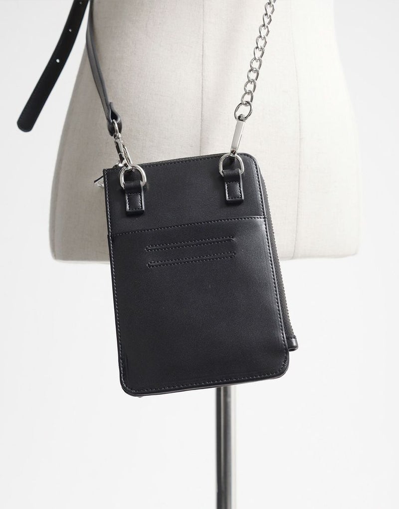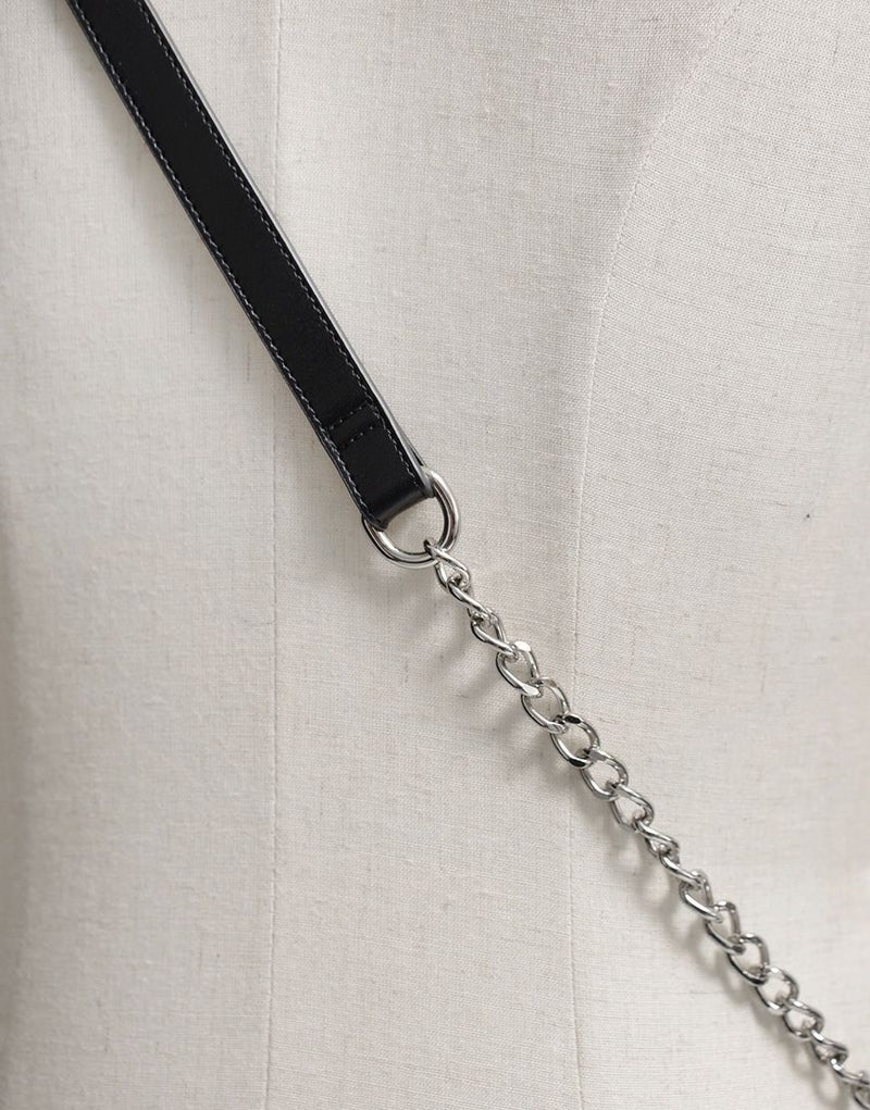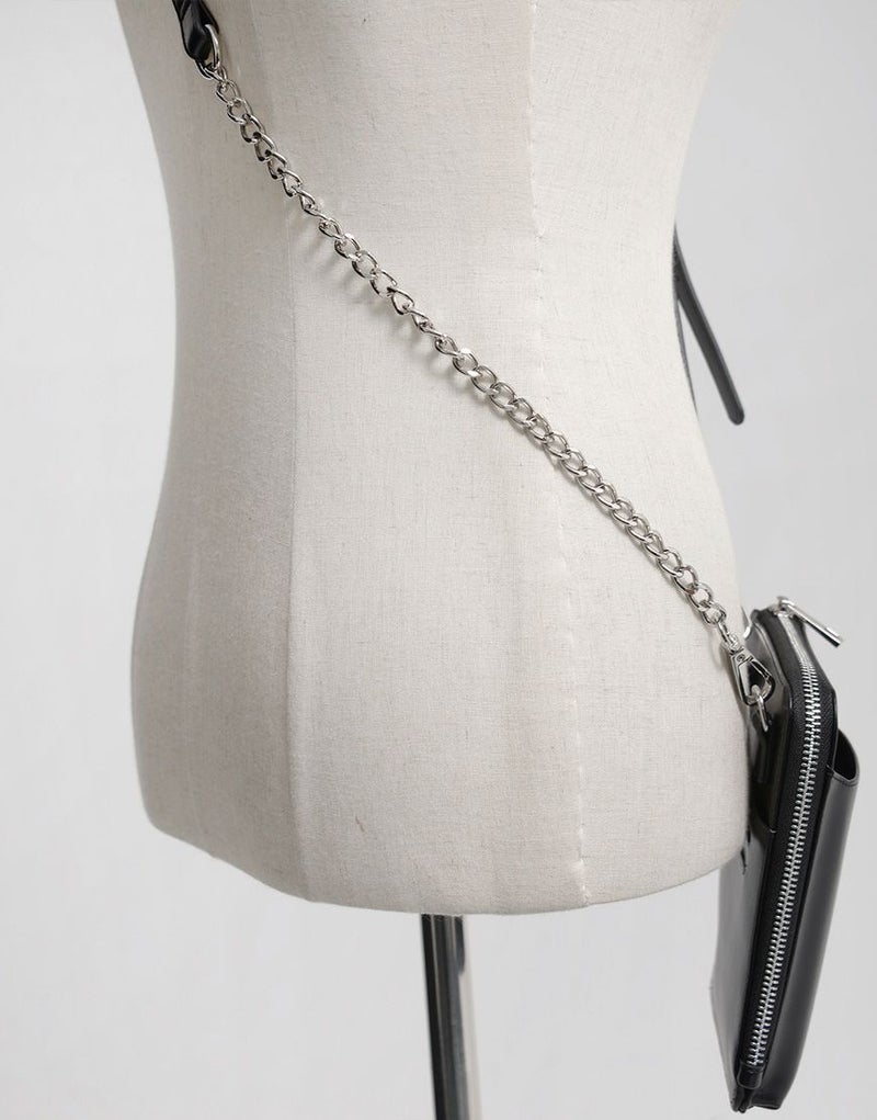チェーンとPUレザー仕様のショルダーベルトは長さ調整ができ、カラビナ付きで取り外しも可能です。