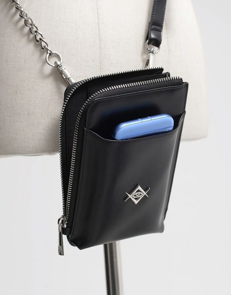 ブランドオリジナルThorn eyeロゴプレートを配置したPUレザーのスマホ用ポーチになります。