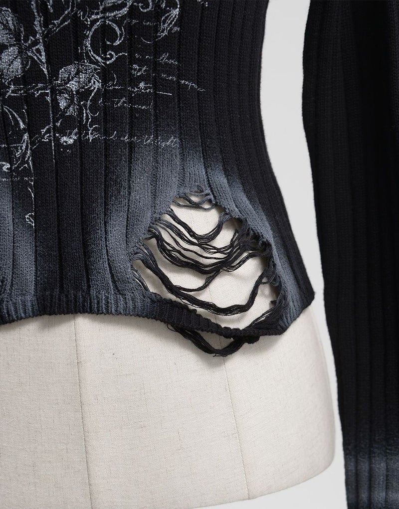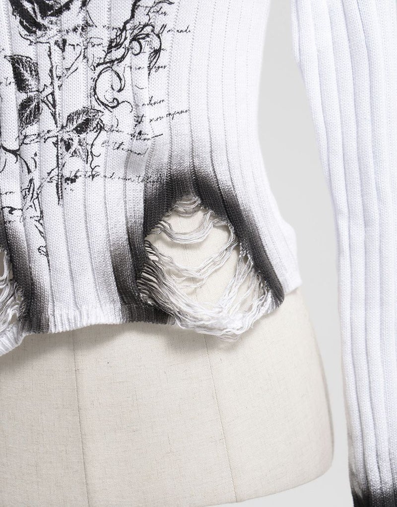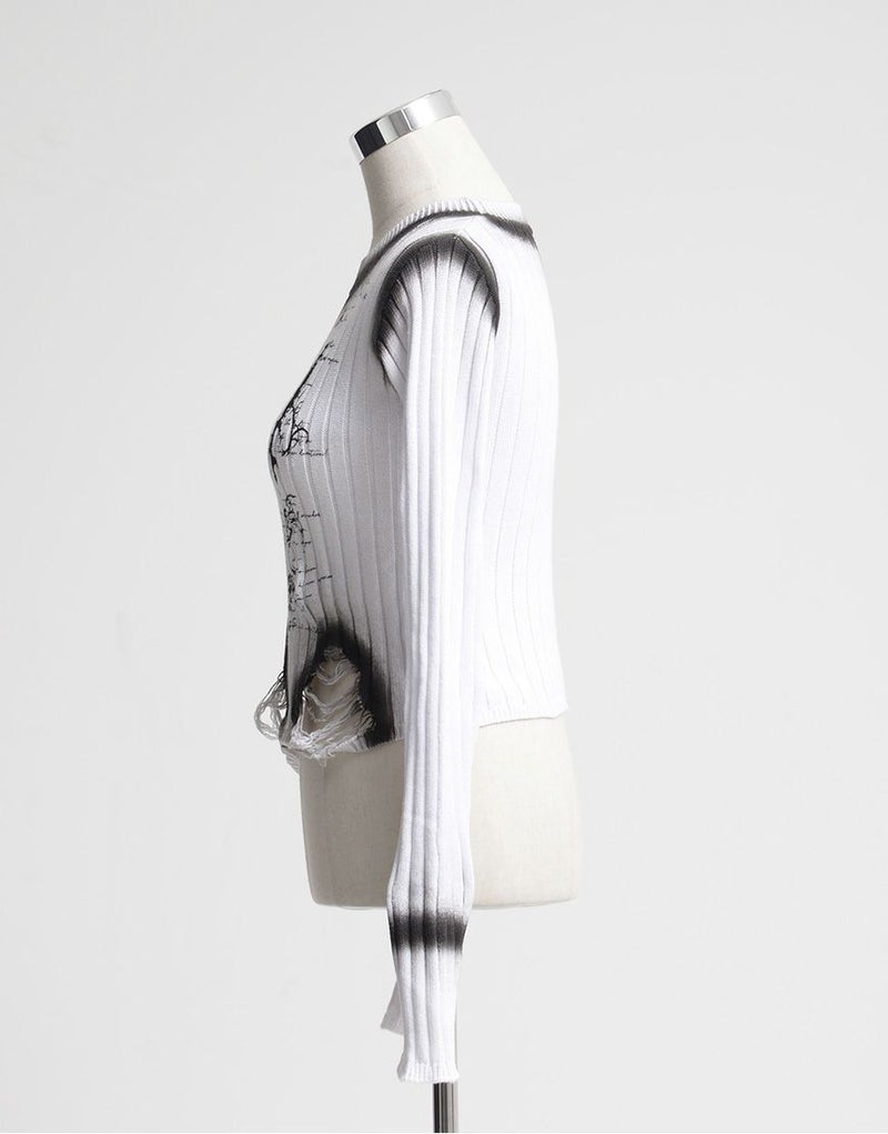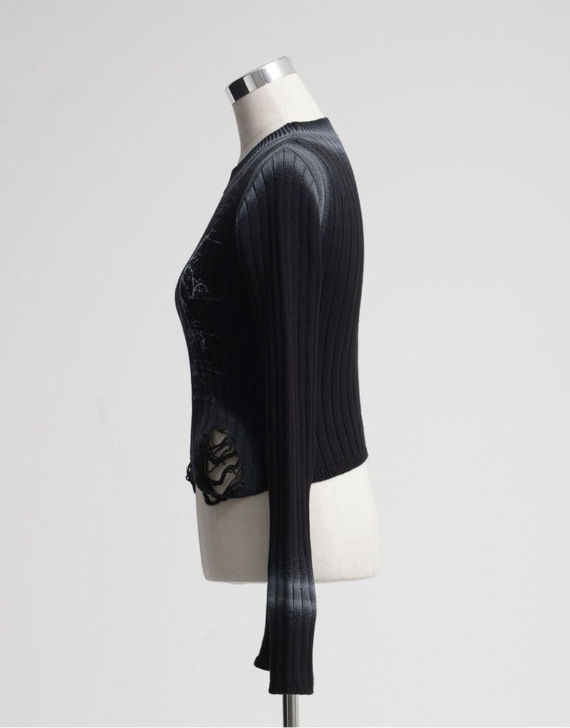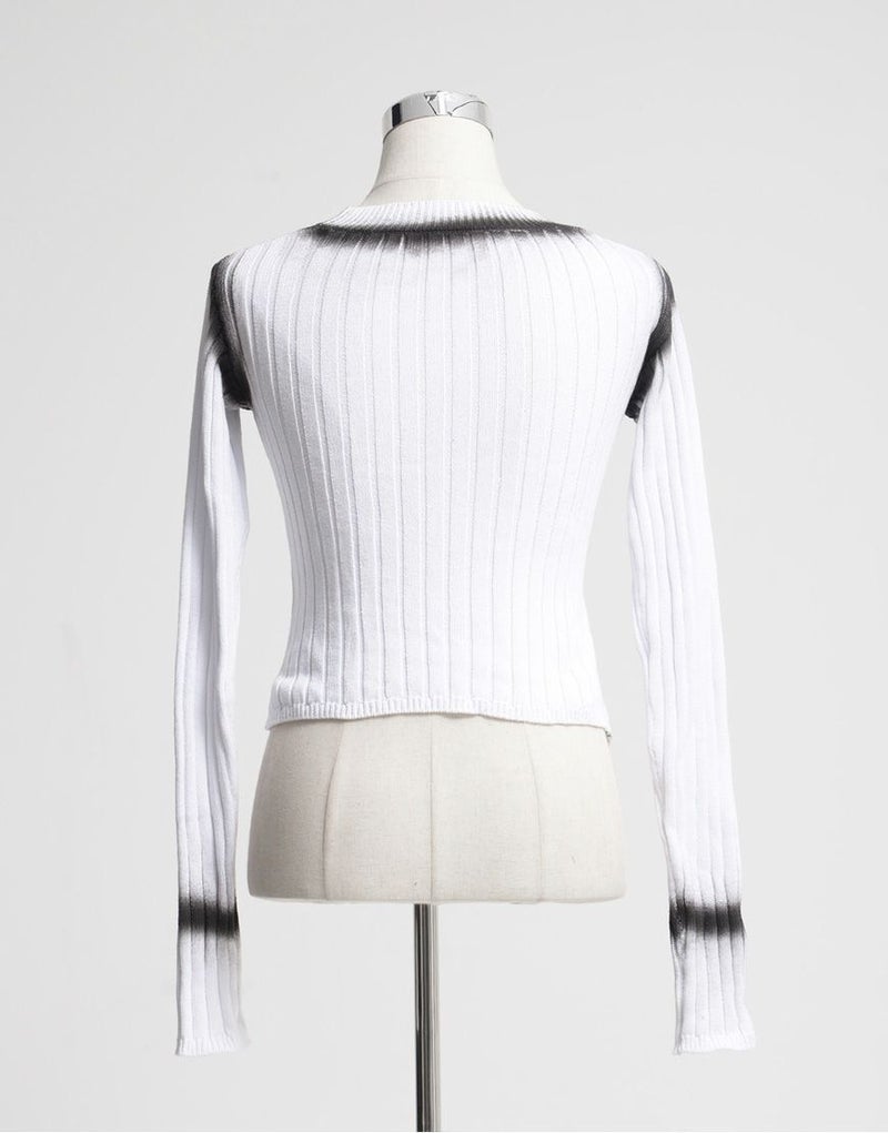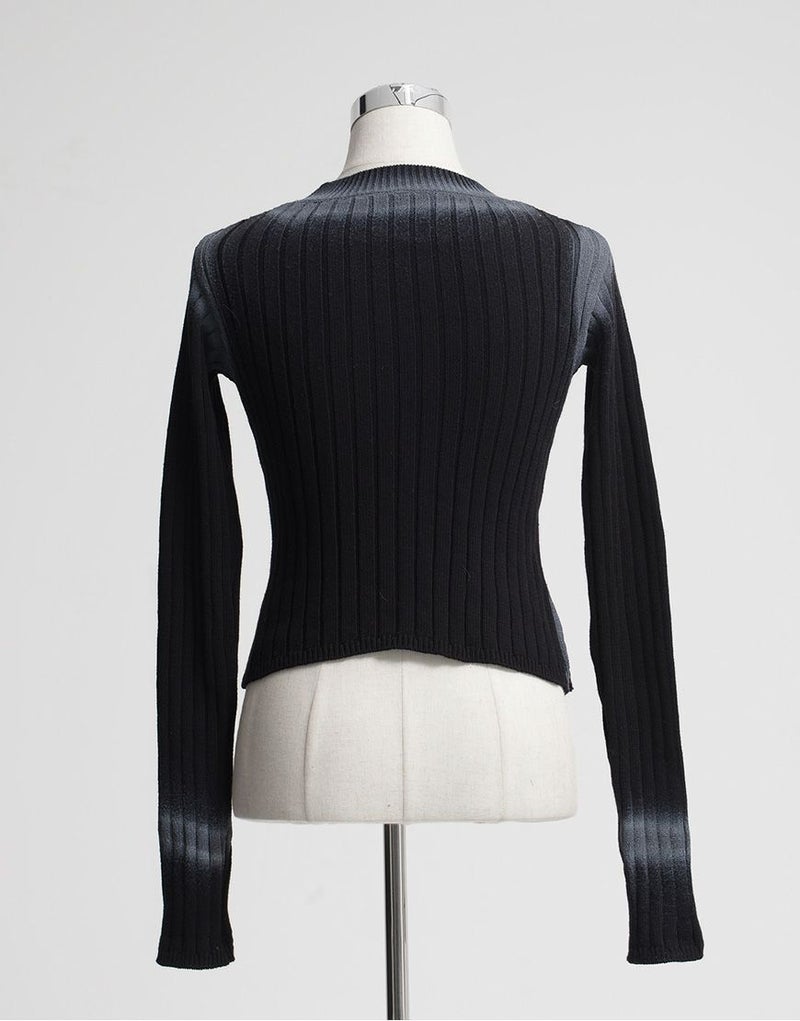 ワイドピッチのリブ編みをベースに、身頃全体へ大きくラウンドするようブロークン編みを施し、立体感と不規則さを演出しています。