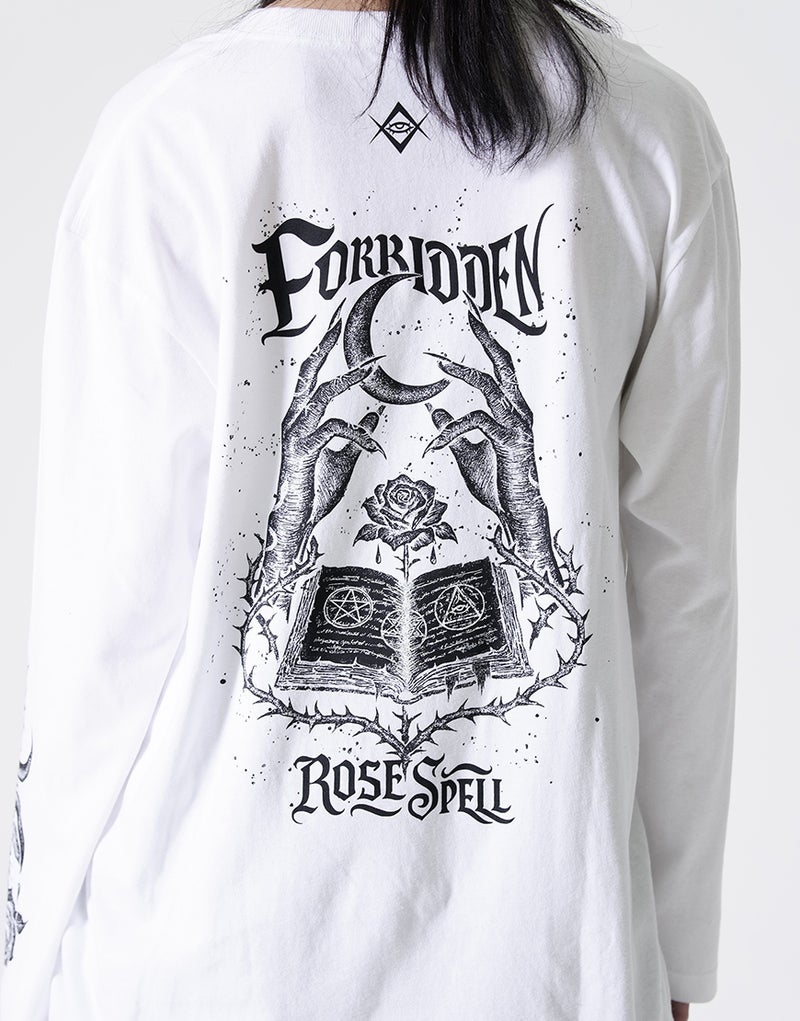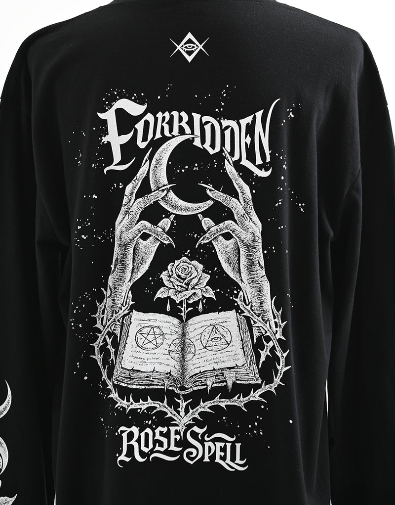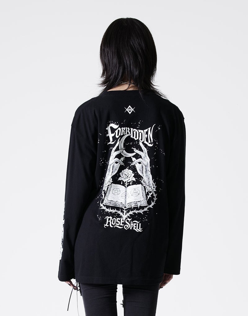 背面には、月を掲げる手元、薔薇、魔導書を組み合わせたシンボリックなアートワークを採用。