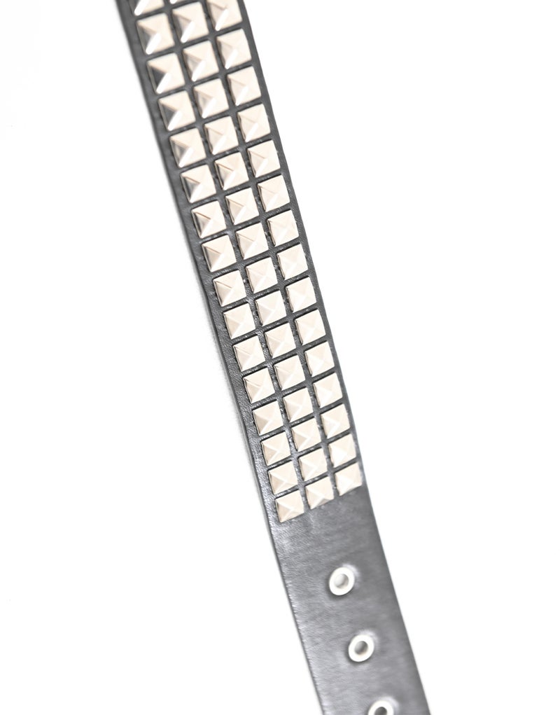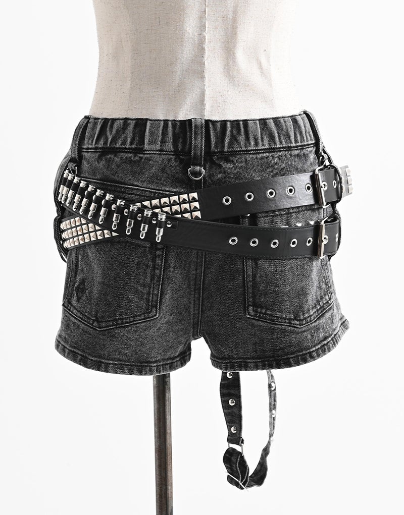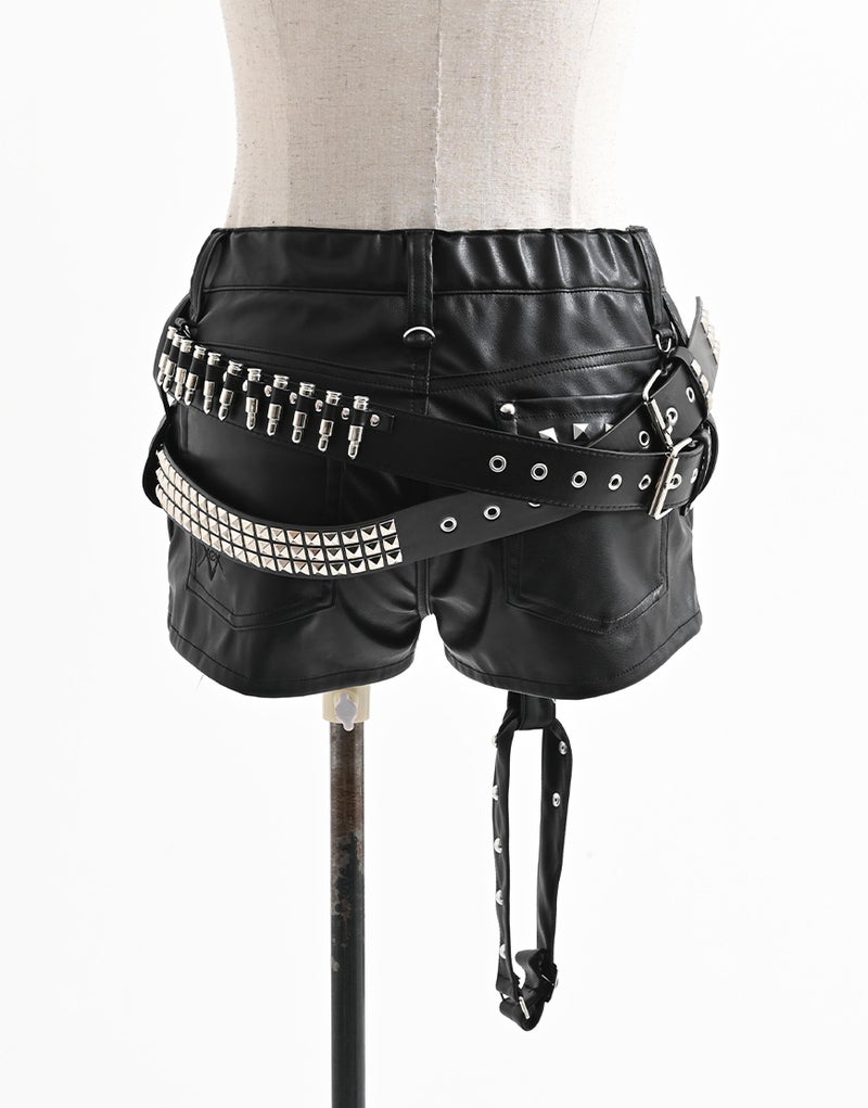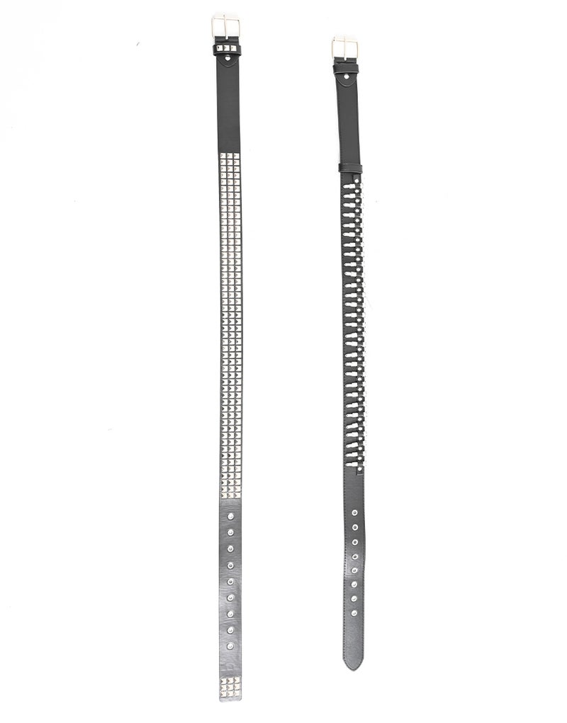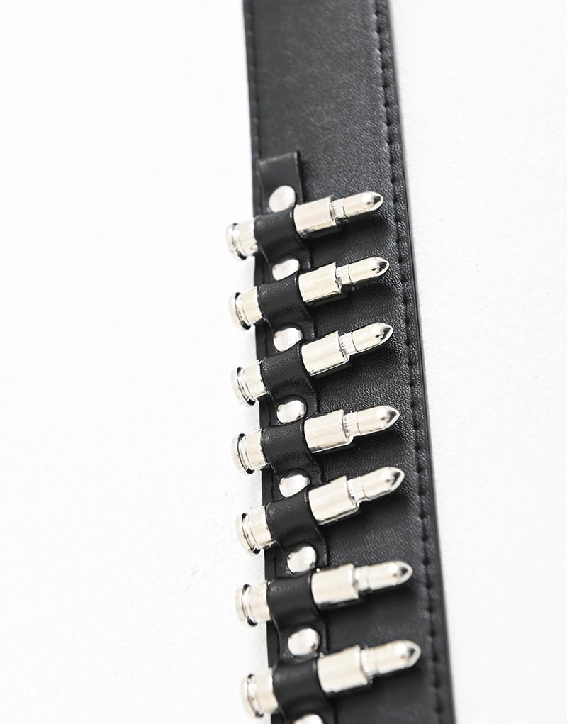 弾丸モチーフのベルトとスタッズベルトの2本がセットになったデザインが最大の特徴。