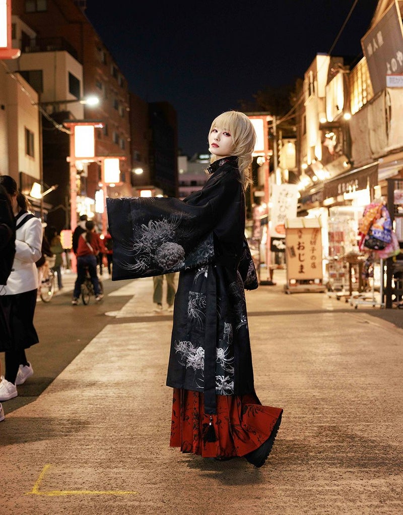 同時発売のAN25-002 曼珠沙華 チャイナ風シャツとAN25-004 曼珠沙華 巻きスカートのセットアップでの着こなしもオススメです。