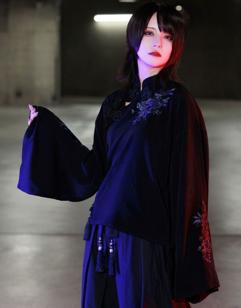 衿まわりとフロントは上品なパイピング仕様、袖は振袖のようなワイドシルエットでドラマチックな印象を与えます。