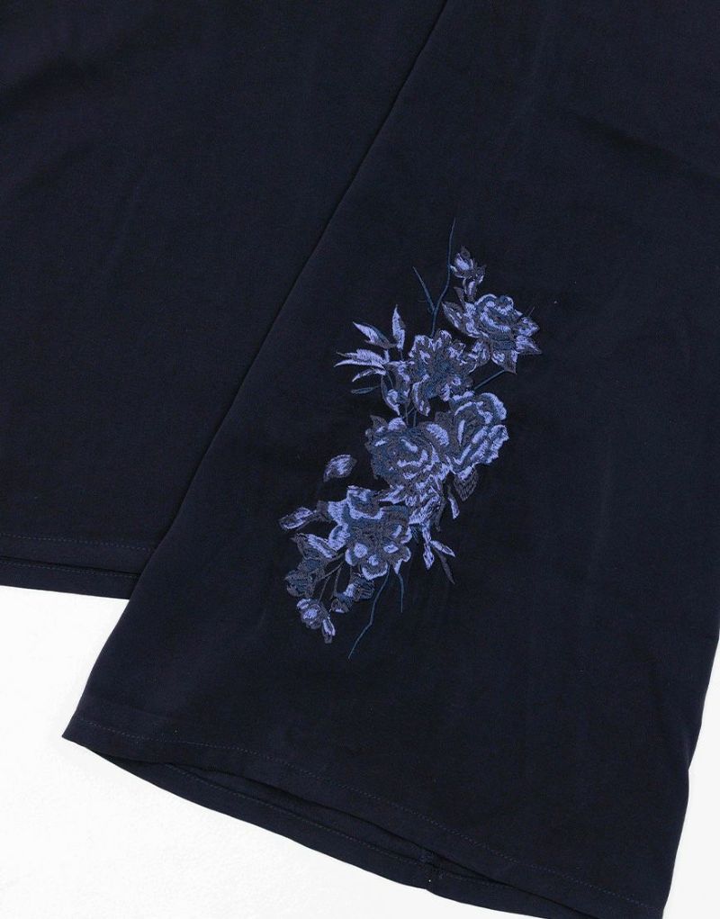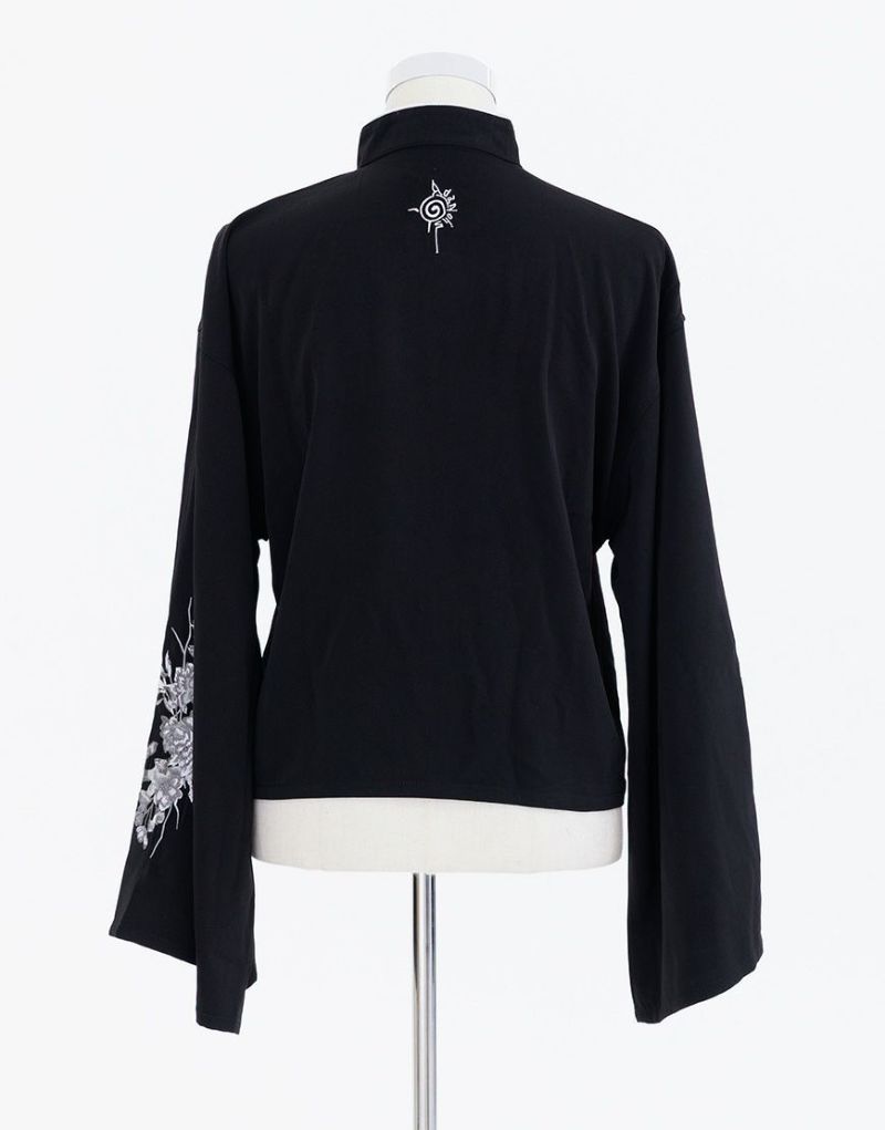 首元と袖には繊細なフラワーモチーフ刺繍を施し、さらに後ろ衿下にもロゴ刺繍を配置。