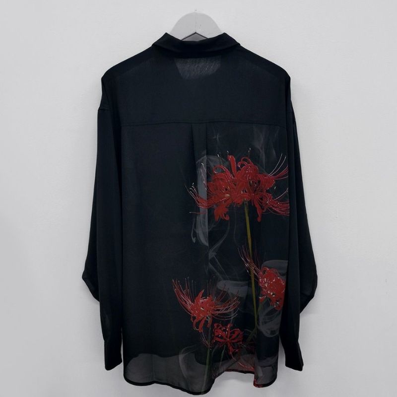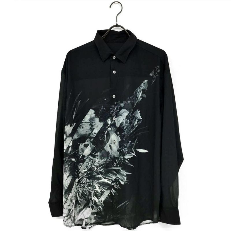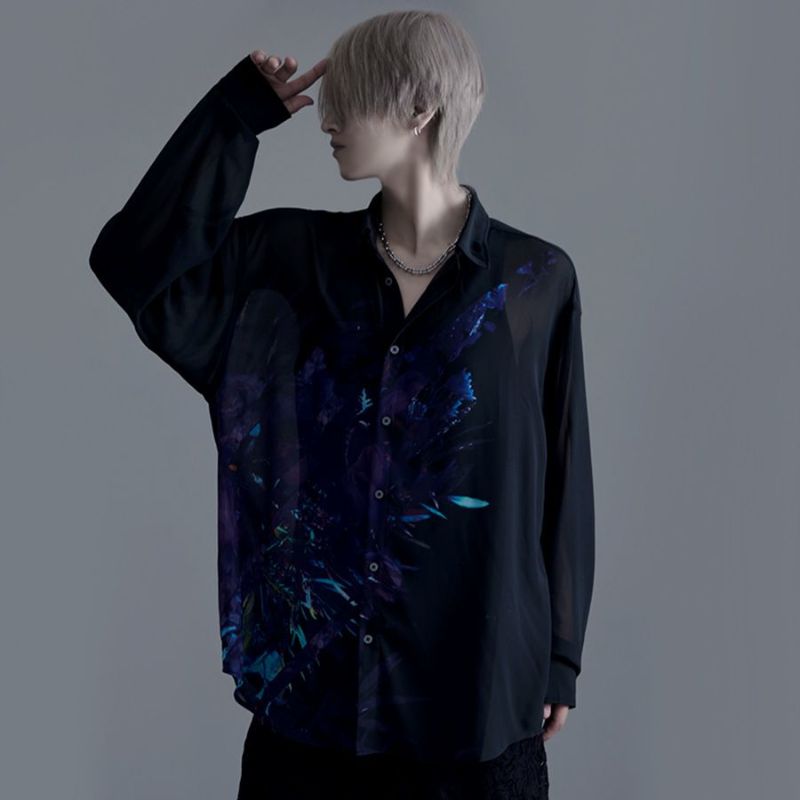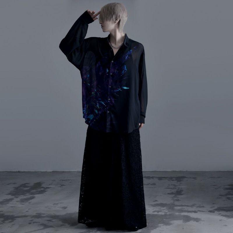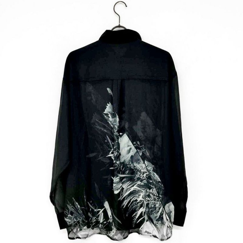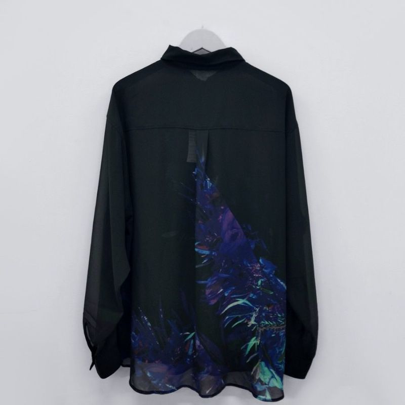 肌が透けるシフォン生地とアートな花柄グラフィックが相まって魅力ある雰囲気を醸した花柄シャツ。