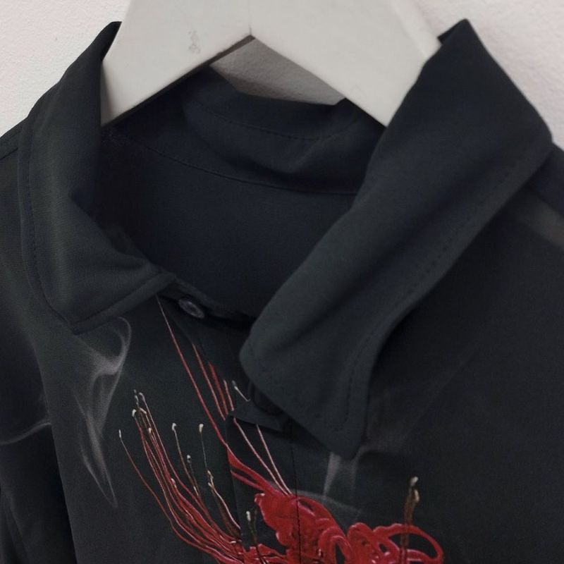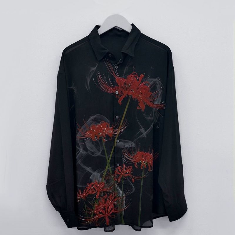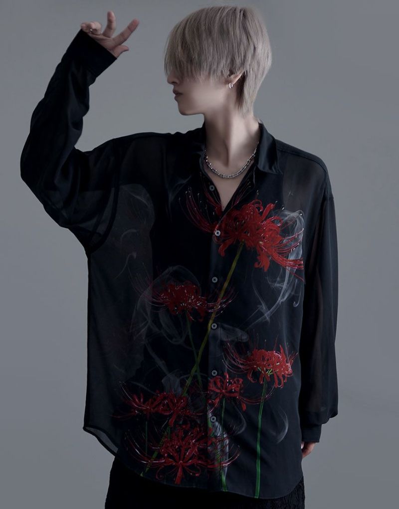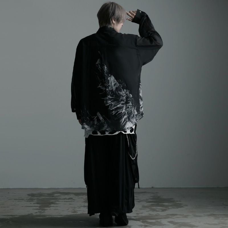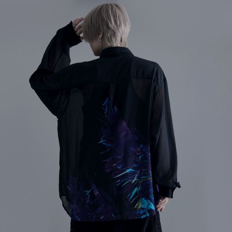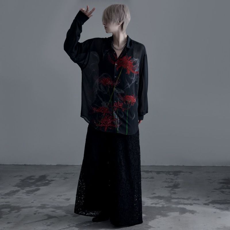 肌が透けるシフォン生地とアートな花柄グラフィックが相まって魅力ある雰囲気を醸した花柄シャツ。