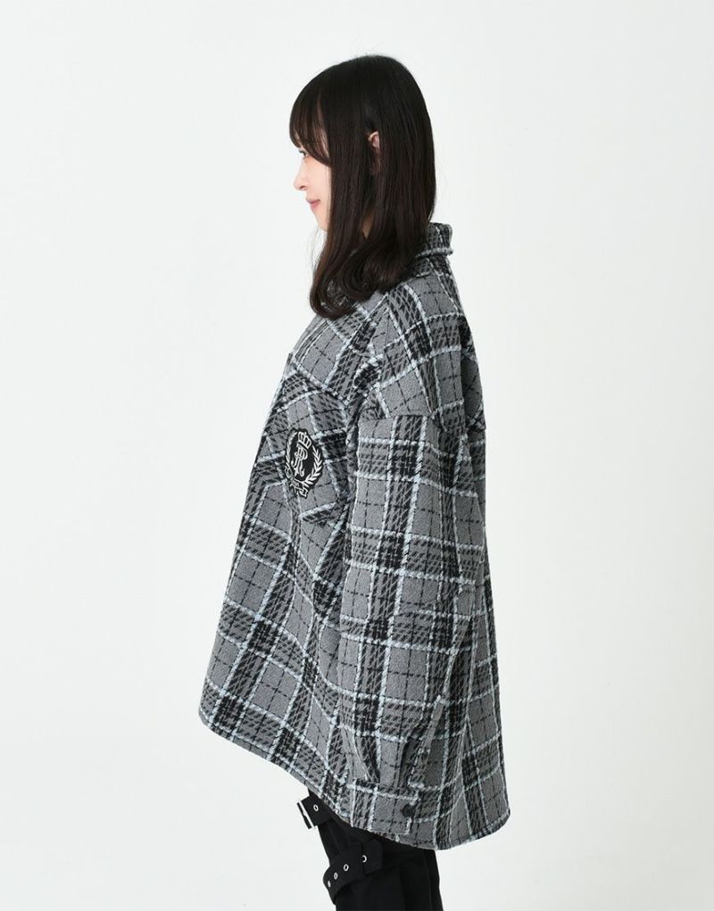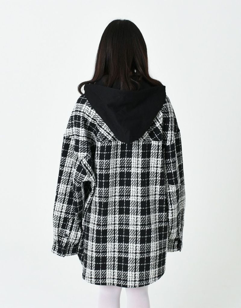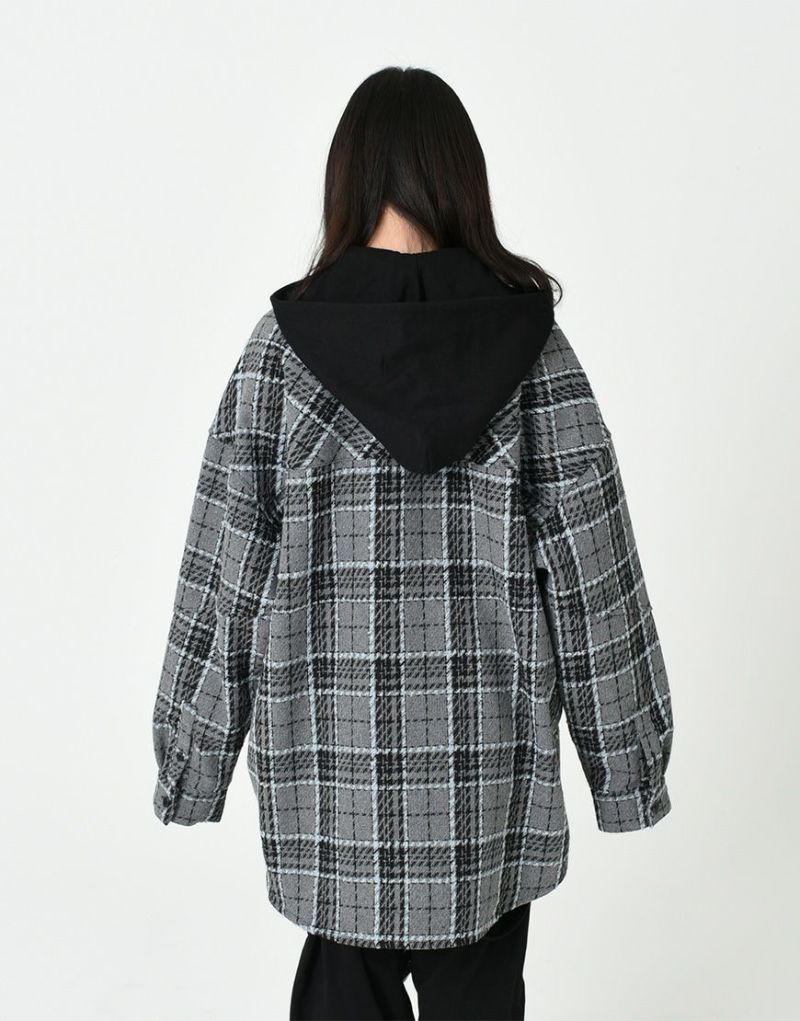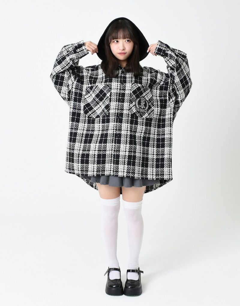厚手のチェック生地を使用。スウェット生地のフード部分はボタンで脱着可能です。