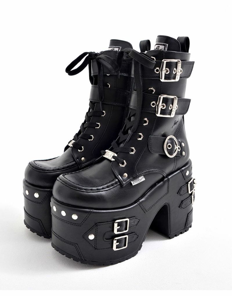 厚底ソールにベルトデザインやスタッズを配置した存在感抜群のブーツ。