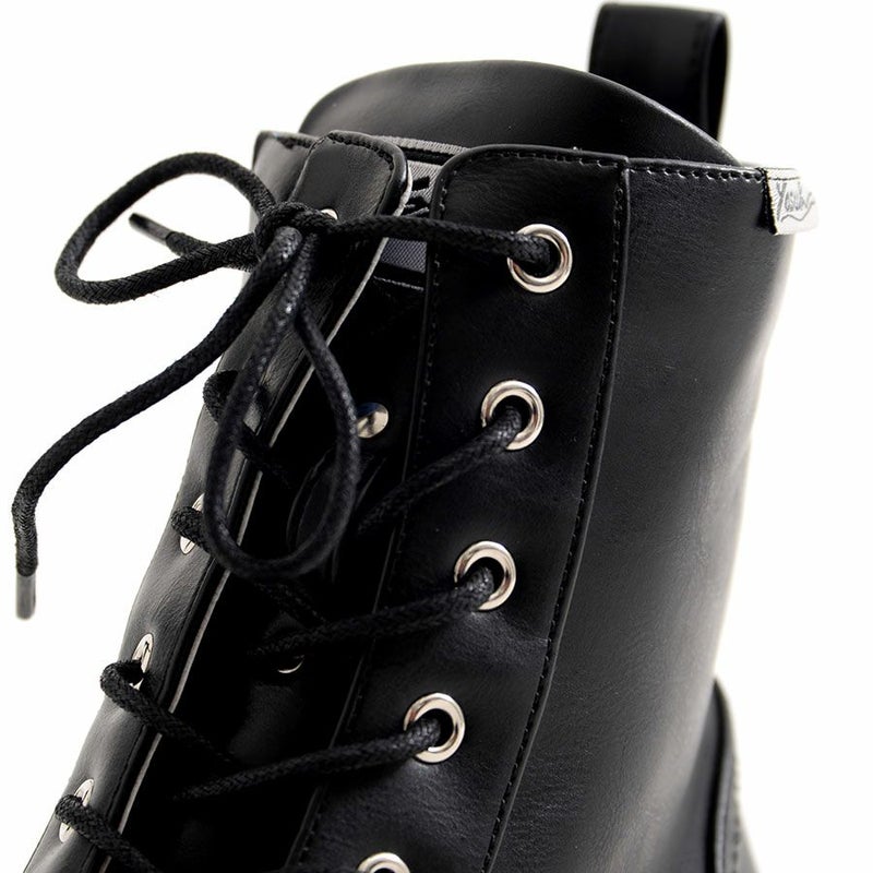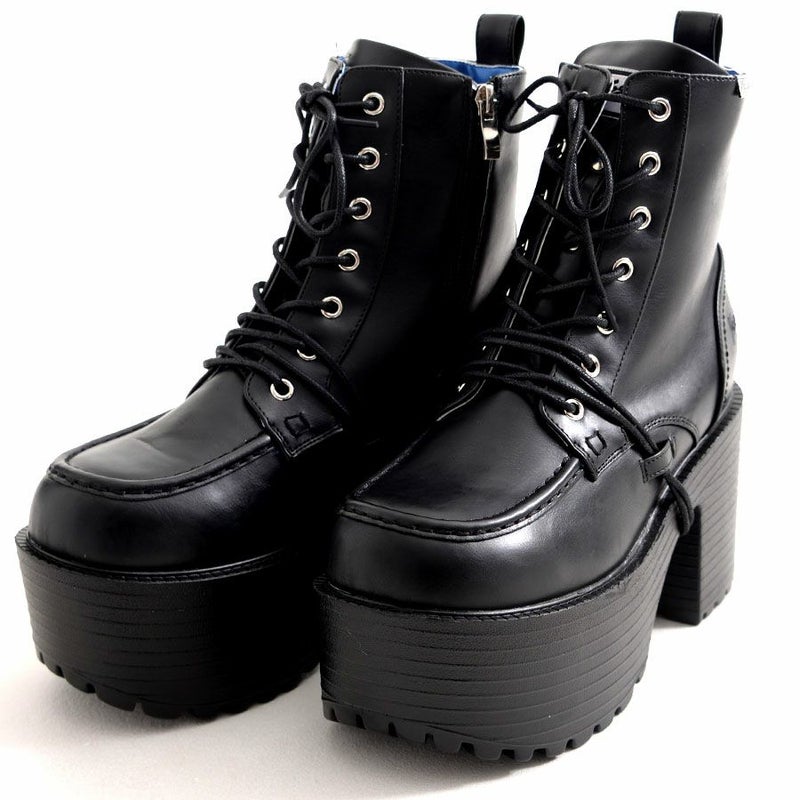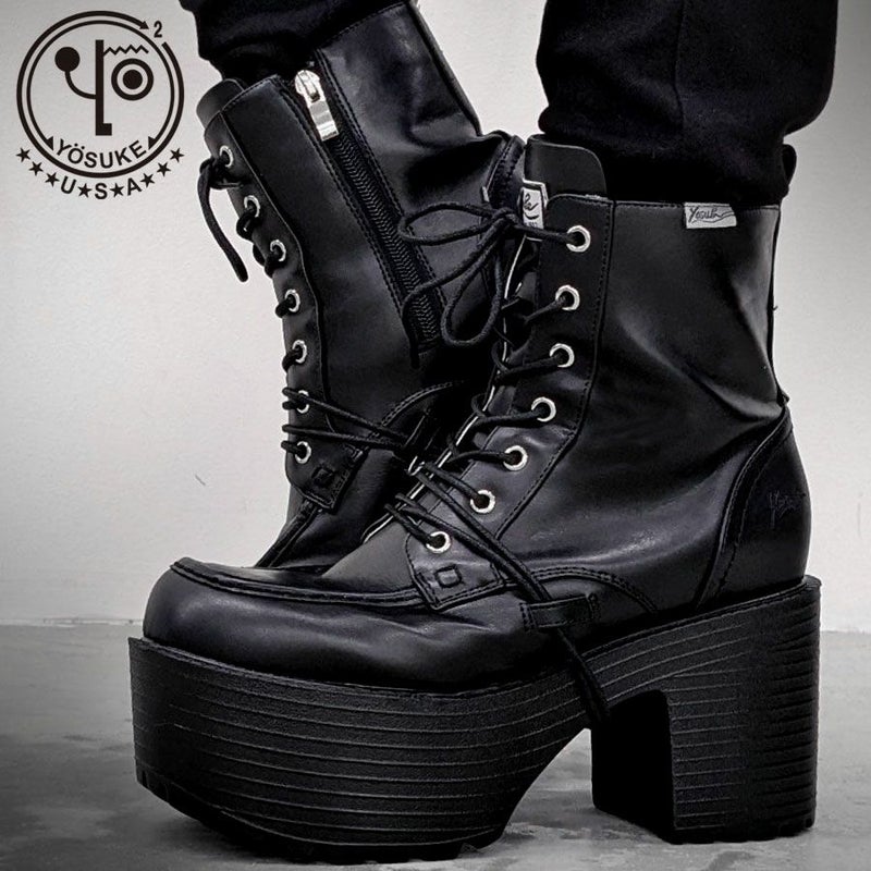 YOSUKEからメンズ紐巻きハイヒールレースアップブーツが入荷。 軽量なのに存在感のあるソールで、歩きやすさもデザイン性も兼ね備えた厚底ブーツ。 変形ヒモ通しのYOSUKEらしいデザインです。 内側ジッパーでサッと脱ぎ履き出来るのも嬉しいポイント。 地雷系スタイルやV系スタイルまで幅広く活躍してくれます。 同デザインの厚底薄めのタイプもあります。